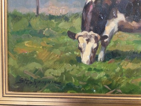 Michael Stephánou (født 1937): Kvier i engen ved sø. Olie på lærred. Sign.: Stephanou 50x60 (61x71) 13911