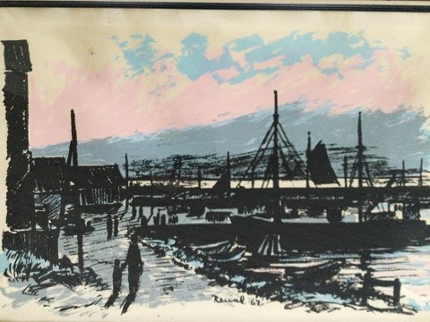 Renal Bache (1926-89): Havneparti 1967. Litografi på papir. Sign.: Renal 67 (i trykket). Indrammet 49x71 6224
