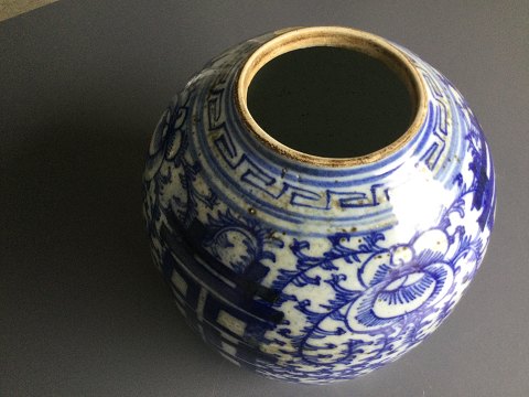 Gammel kinesisk urne/bojan med låg. Blå dekoration med lykke symboler. Tung Chih perioden (1862-75). Højde med låg 22 cm. Diameter i bund 22 cm. 5124