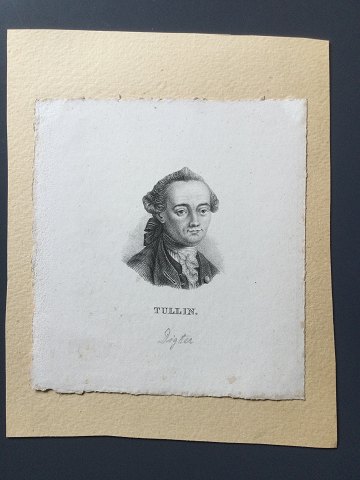 Ubekendt kunstner (18/19 årh): Portræt af den norske digter Christian Baunmann Tullin (1728-65). Kobberstik på papir monteret på pap. Usigneret. Betegnet - TULLIN Uden ramme 14x13 - Mål med pap 20x16 3122