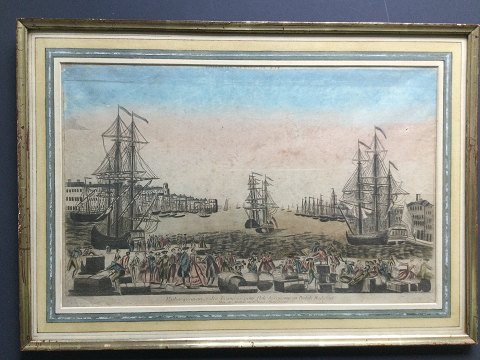Jacques Chereau (1688-1776): "Embarquement des Francais pour...." Håndkoloreret Kobberstik på papir. Indrammet i smuk "sølv" ramme hos Hugo Kerr i Hamburg. 27x43 (37x52) 23824
