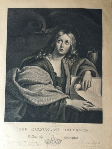 Ferdinand Bahmann (født 1800): Evangelisten Johannes 1834 Stålstik på papir, Efter maleri af Domenico Zampieri (1581-1641) Sign.: Ferd. Bahmann sculps - Domenichino oinx Uden ramme 47x34