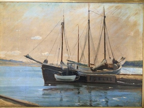 Gunner Bundgaard (1920-2005): Parti fra havnen i Hadsund. Olie på lærred. Defekt på lærred (se fotos) Sign.: G. Bundgaard 50x70 (62x82) 7225 Gunnar Bundgaard