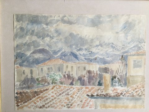 Ellen Krause Rørup (1905-90): Parti fra Sparta 1962. Akvarel på papir. Sign.: Ellen Krause Betegnet - Sparta 6-2-62. Smuk guldramme 28x39 (43x52) 22625
