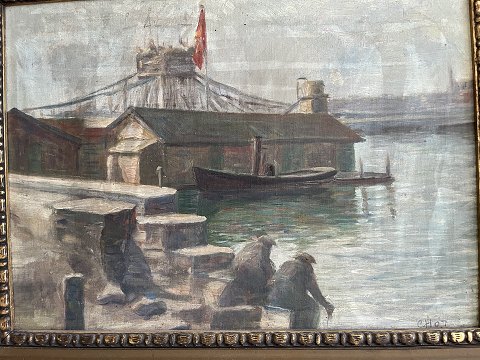 Catharine Heyerdahl (1861-1952): Parti fra Havnen 1907. Olie på lærred monteret på plade. Sign.: CH 07. Bagpå plade betegnet Carl Holsøe - Parti fra Havnen. 29x39 (42x52)