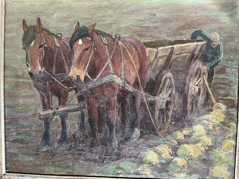 Marius Jensen Hindevad (1885-1977): Kål høsten bringes i hus 1950. Olie på lærred Sign.: Monogram MJ 50 Indrammet i smuk ældre "sølv" ramme. 39x51 (46x57)