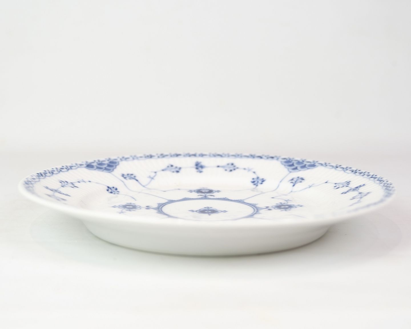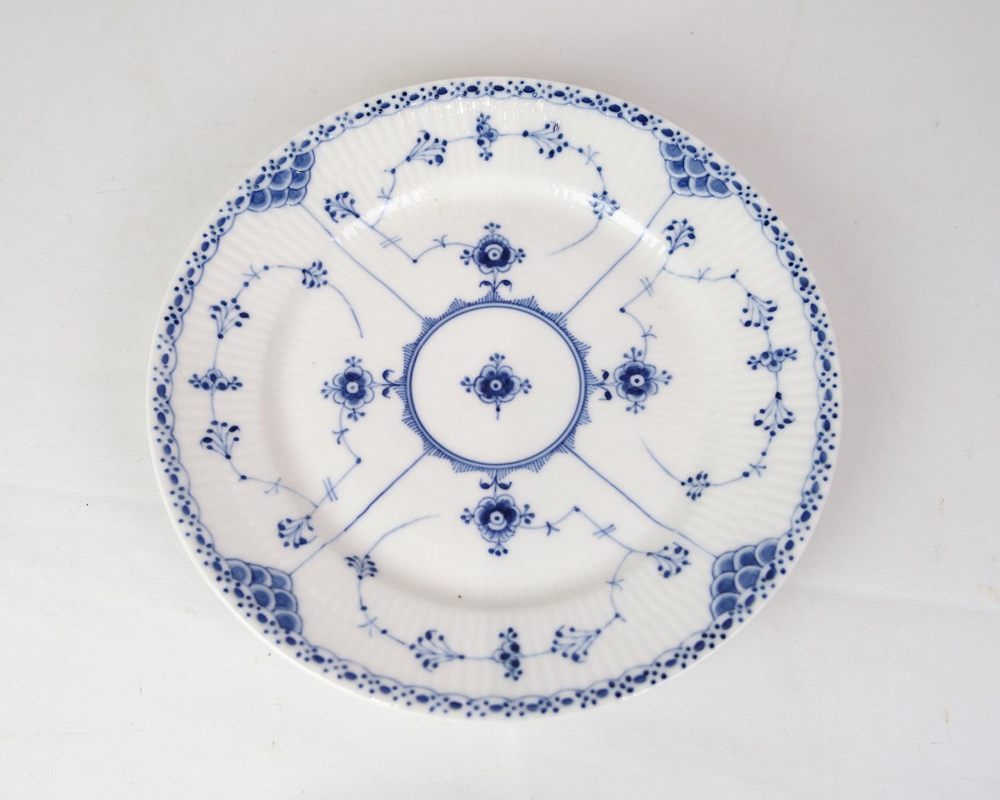 SoldLunch plate marked 1/578 from Royal Copenhagen. Made of porcelain with blue-fluted half-lace design, plate is hand-painted in blue decoration.