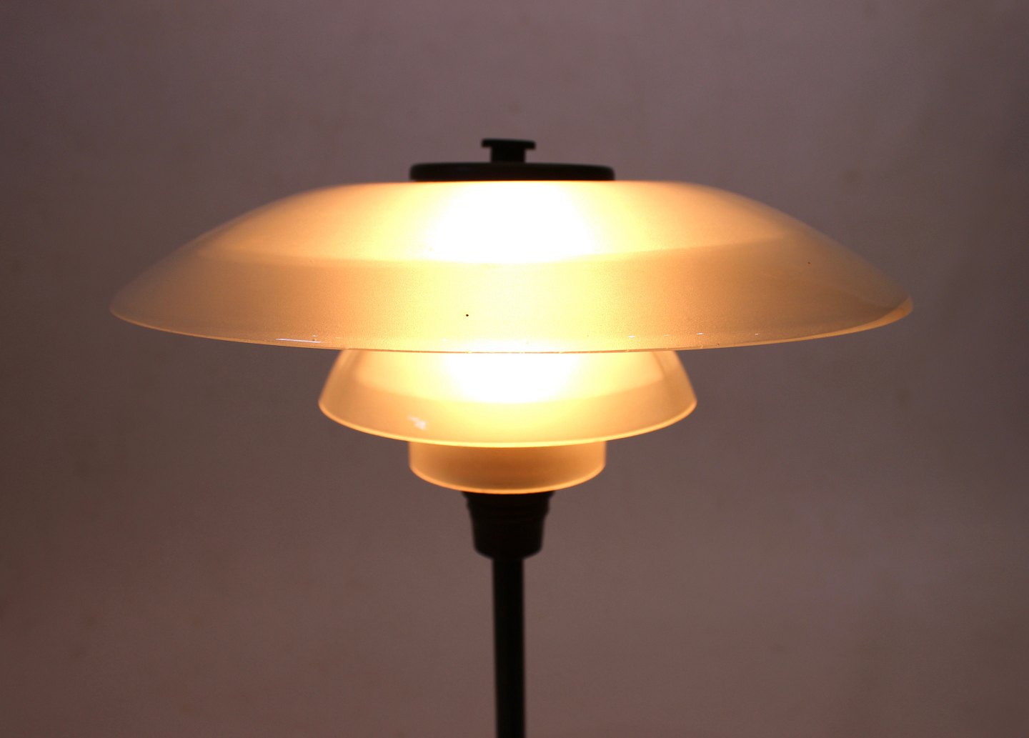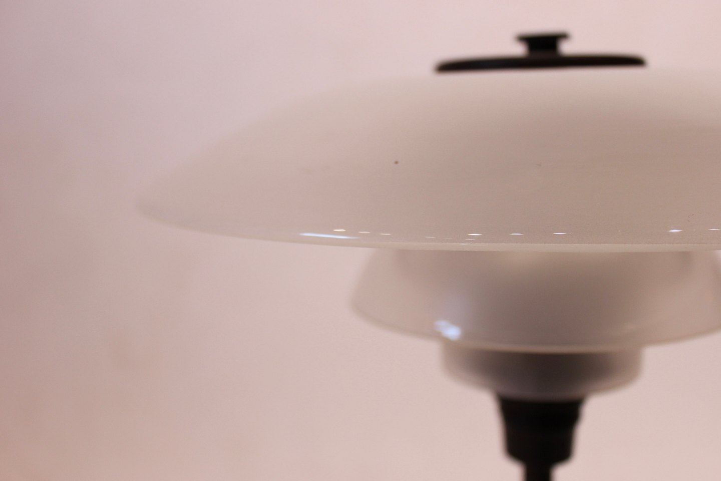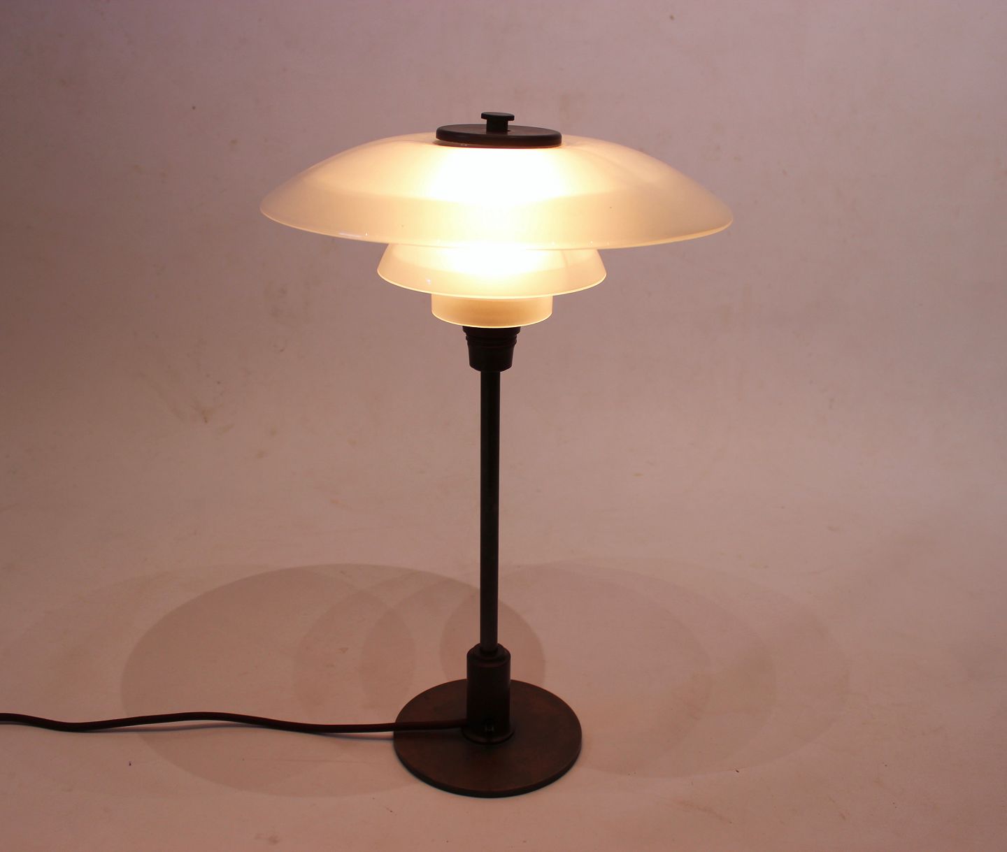 PH 3/2 bordlampe med skærme af mat glas og stel af bruneret messing, af Poul Henningsen og Louis Poulsen.