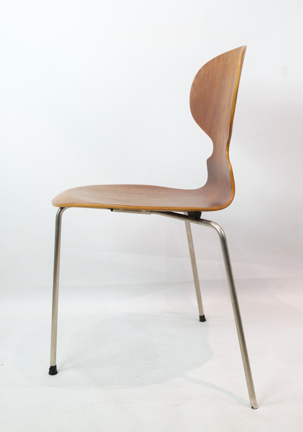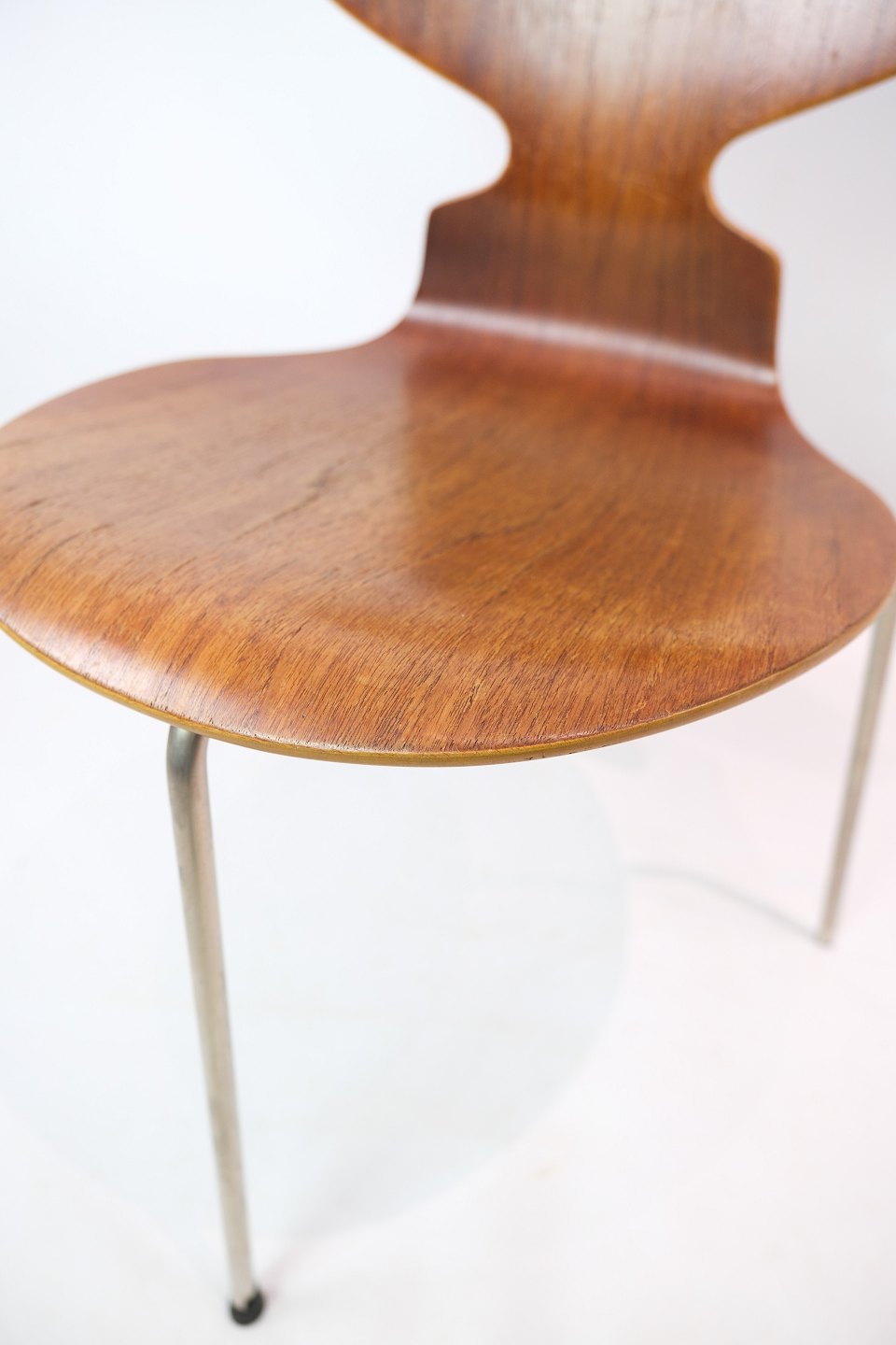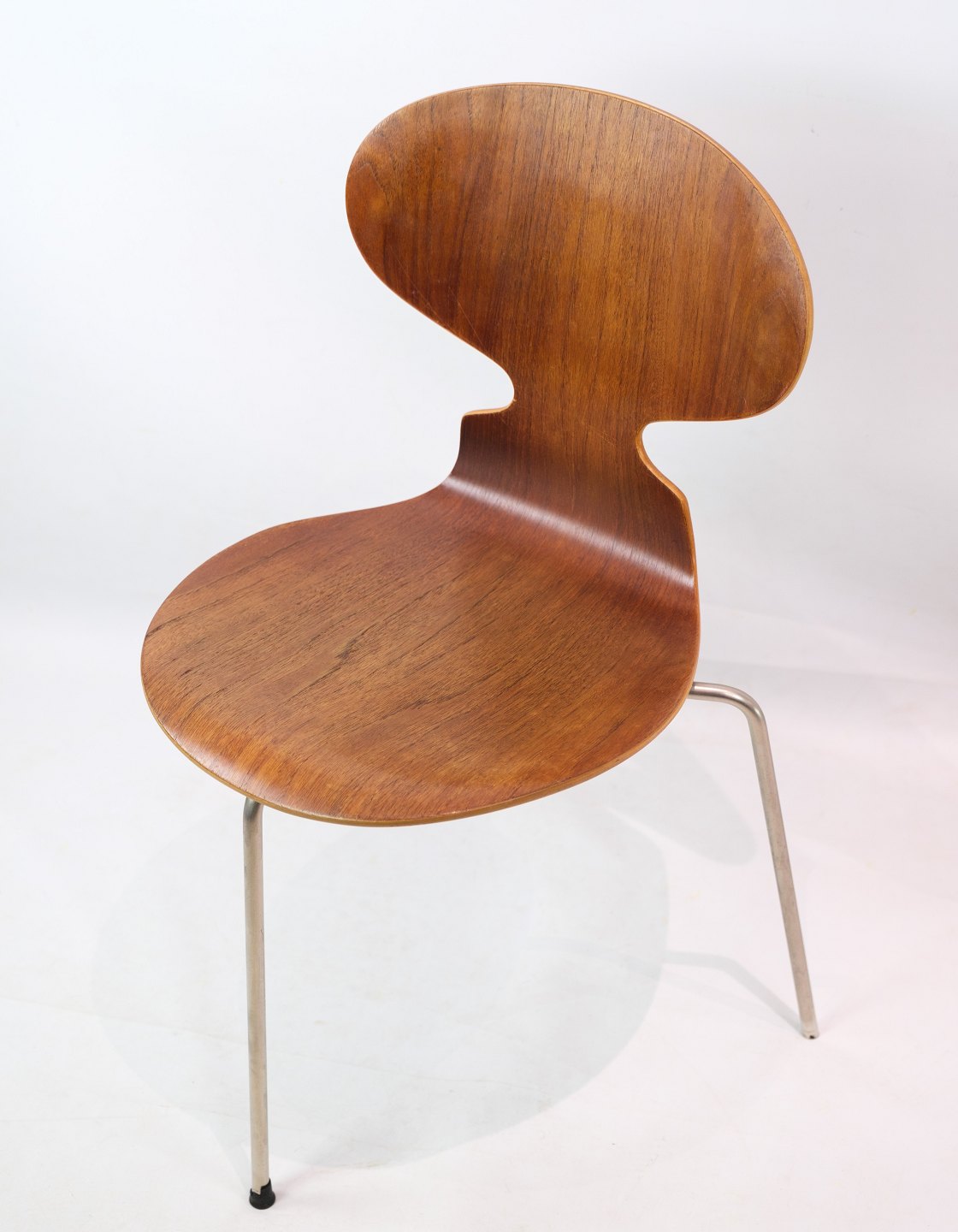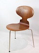 SolgtMyren, model 3100, designet af Arne Jacobsen i træsorten teaktræ fremstillet hos Fritz Hansen fra omkring 1950'erne. Denne stol er med tre ben af metal og er en meget tidlig model, grundet metalbeslag i bunden. Fremstår i meget fin brugt stand.