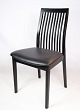 Sæt af 4 spisestuestole, model 712, i sort bejdset ask fremstillet af K. Høffer Larsen A/S. Mellemhøj spisestuestol, med lodrette pinde i ryggen, der giver god siddekomfort.