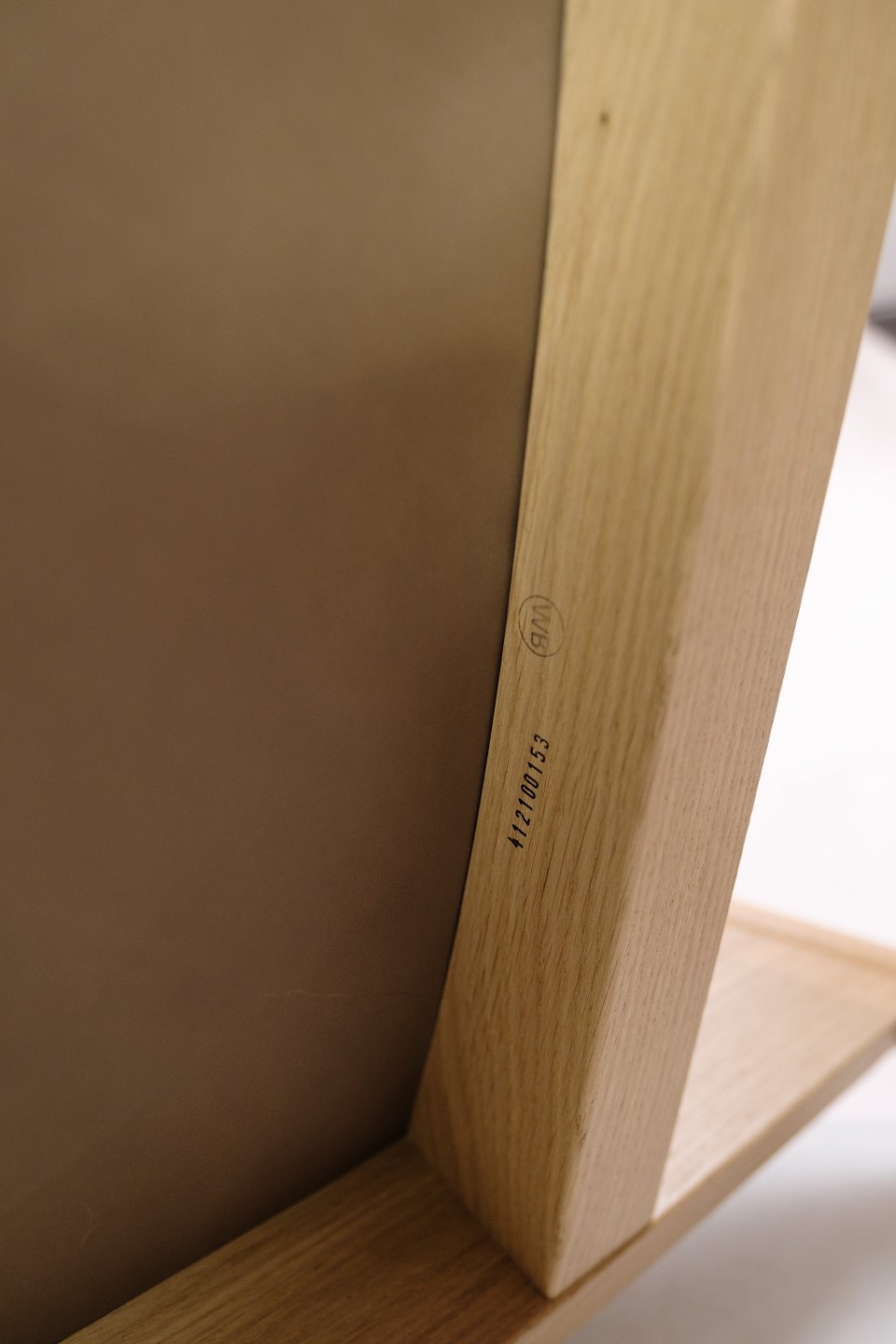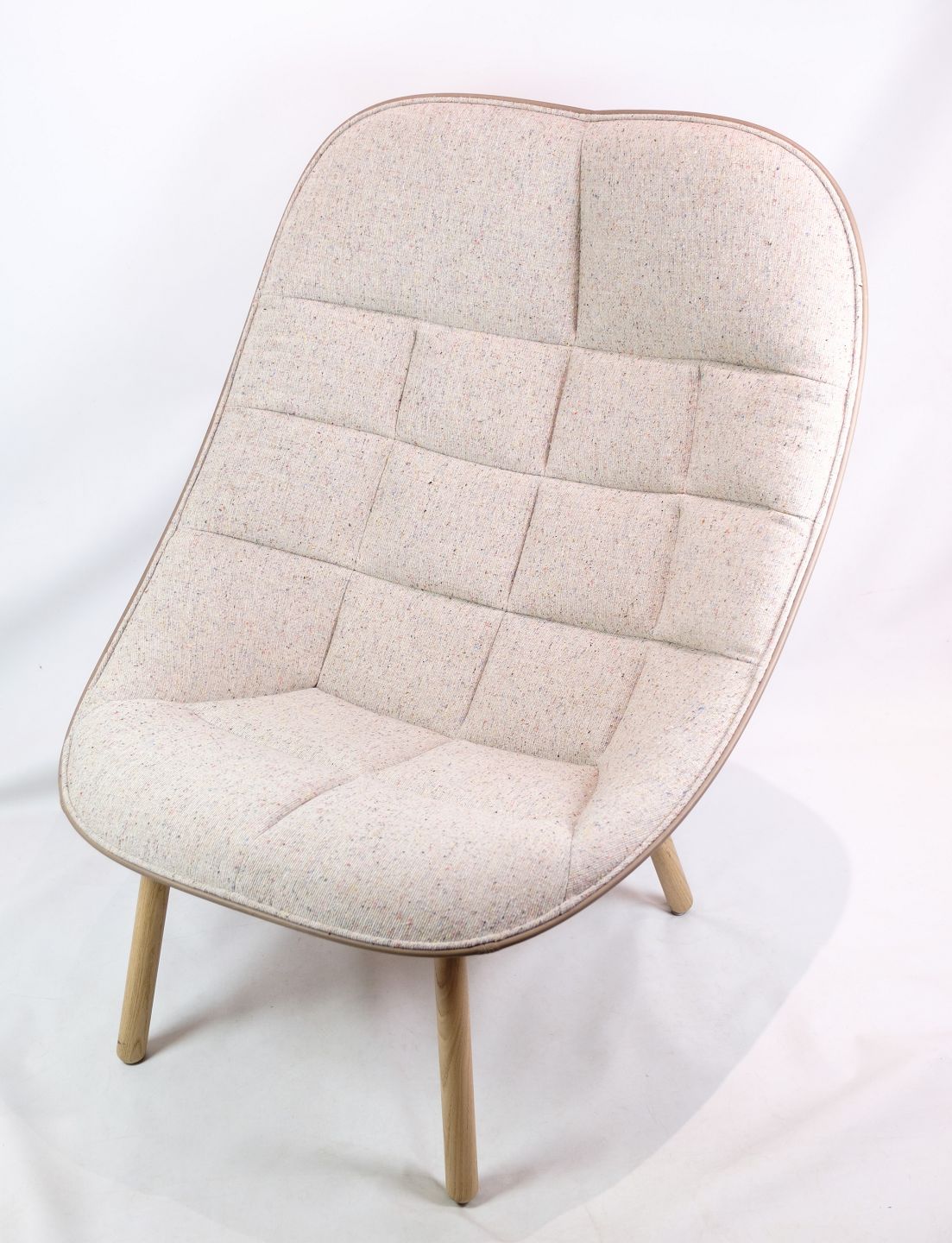 SolgtLænestol, model Quilt, designet af Doshi Levien fremstillet af Hay. Stolen er med stel af egetræ og stoffarven Bolgheri LGG70 / Sense Nougat