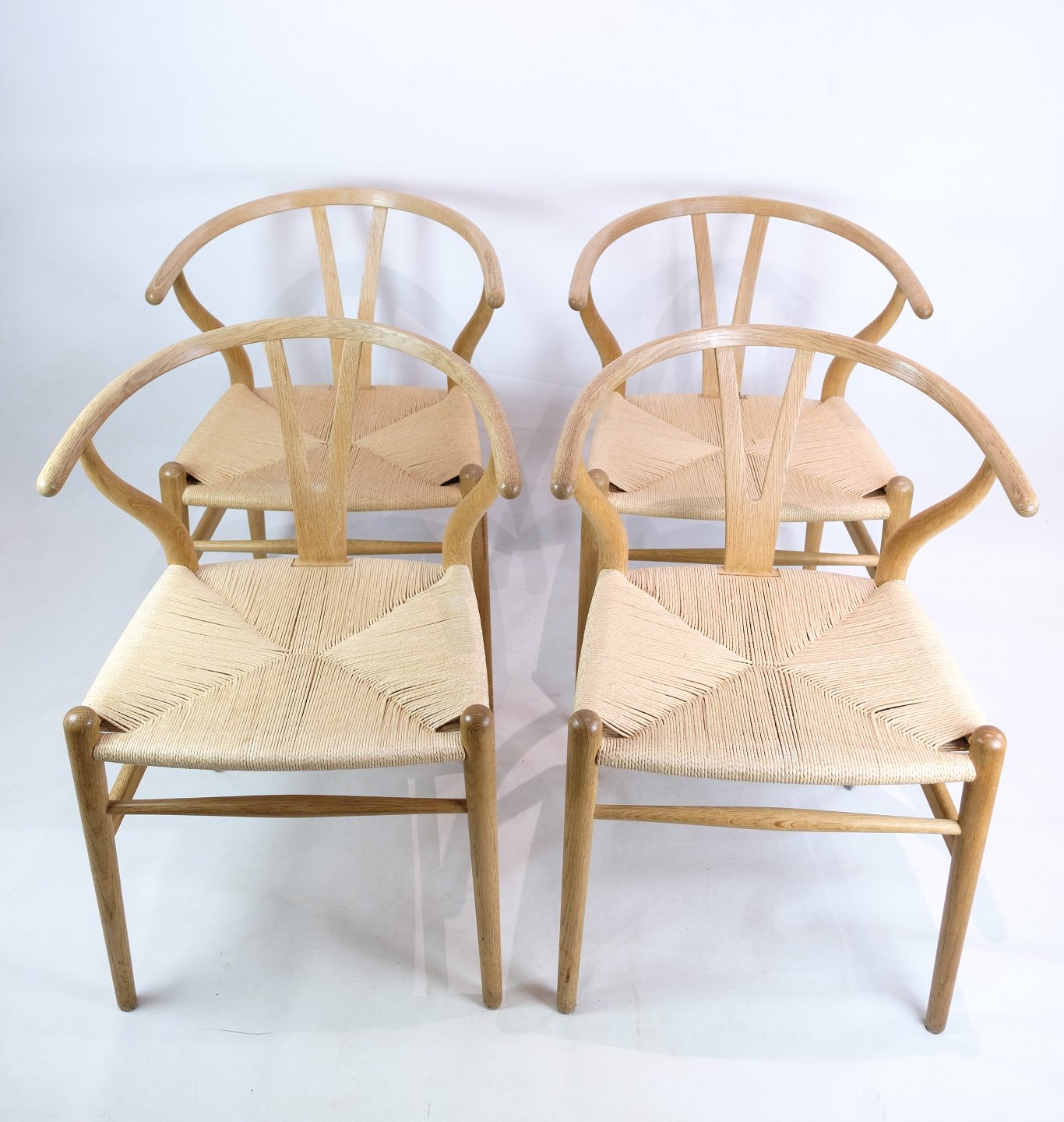 SolgtSæt af fire y-stole model ch24, lavet i egetræ. Designet af Hans J. Wegner og fremstillet af Carl Hansen & Søn. Stolene er fra 1990erne