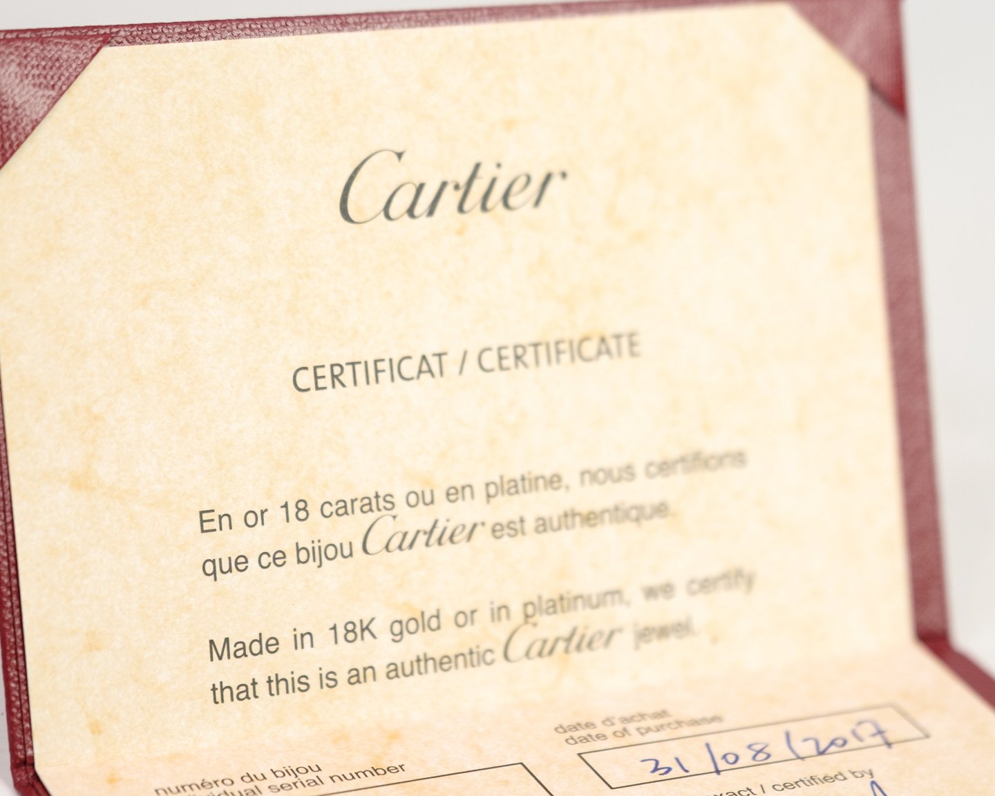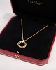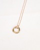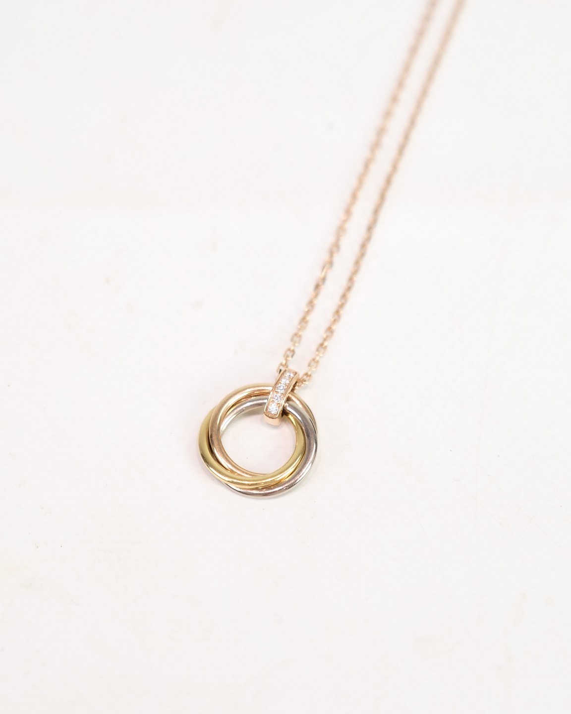 Halskæde fra Cartier, fra Trinity-kollektionen. Kæden er udført i 750 roséguld med sikkerhedslås og prydet med et vedhæng bestående af tre sammenflettede ringe i hvidguld, roséguld og gulguld – en klassisk Cartier-signatur.