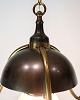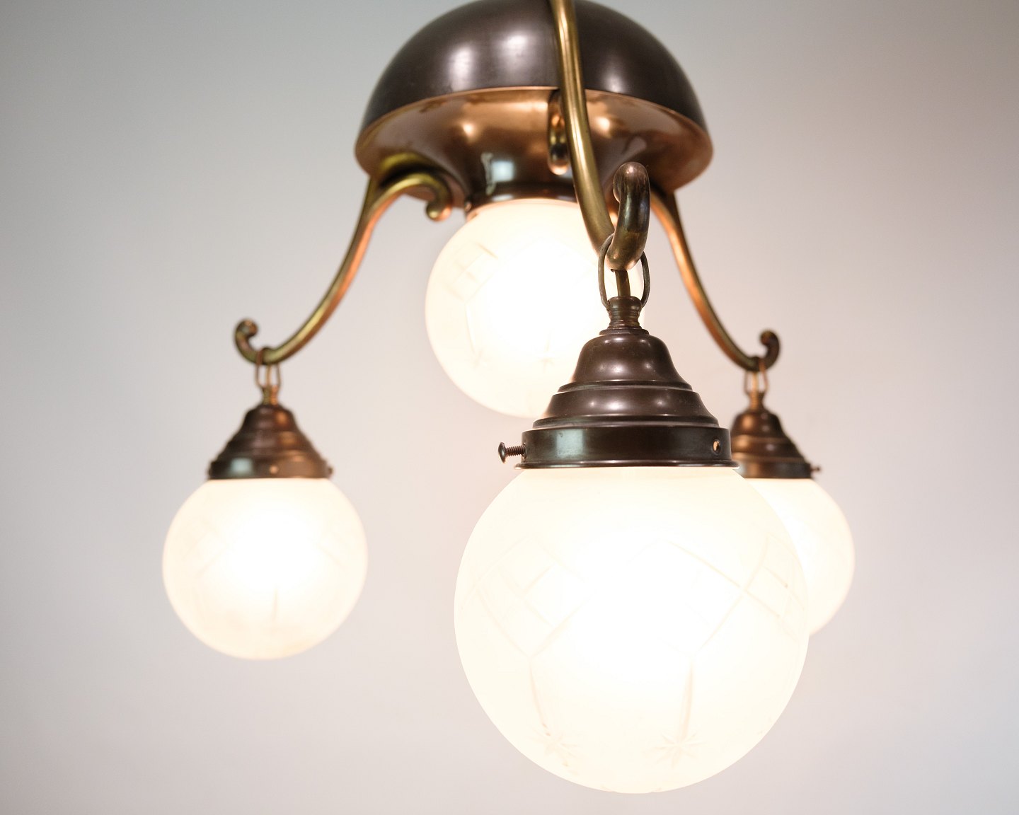 Sold3-armed Art Nouveau chandelier from the 1930s in burnished brass with opal glass balls. Classic ceiling lamp with decorative elegance.