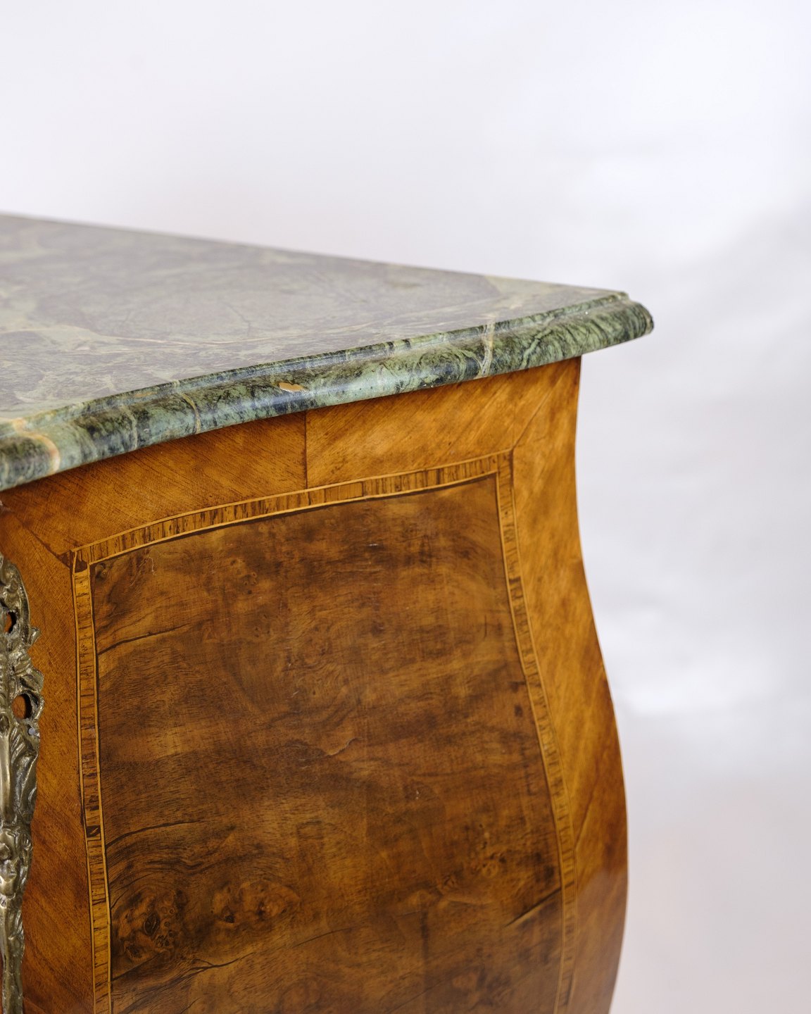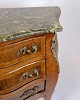 Kommode i rokokostil med marmorplade og messinggreb. Udført i nøddetræ. Klassisk møbel med dekorativt udtryk.