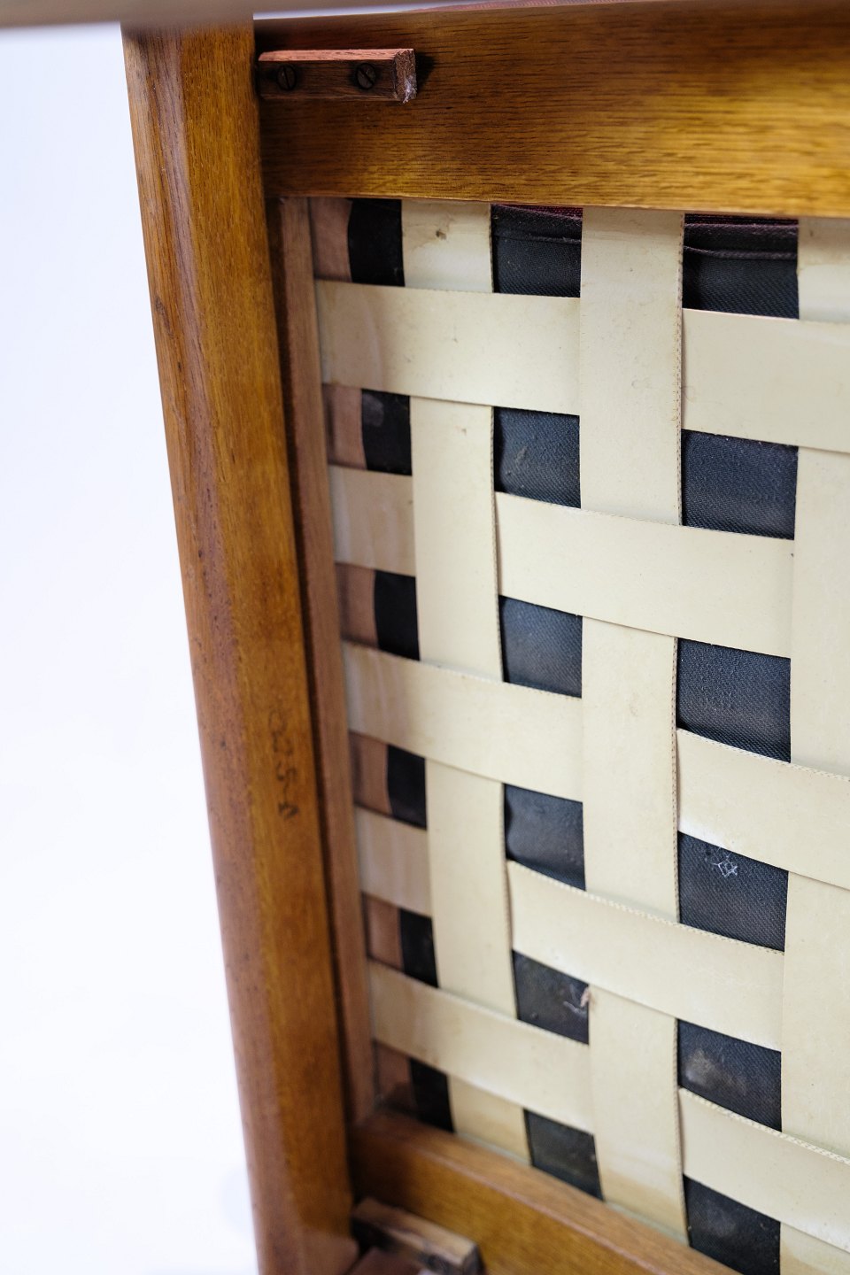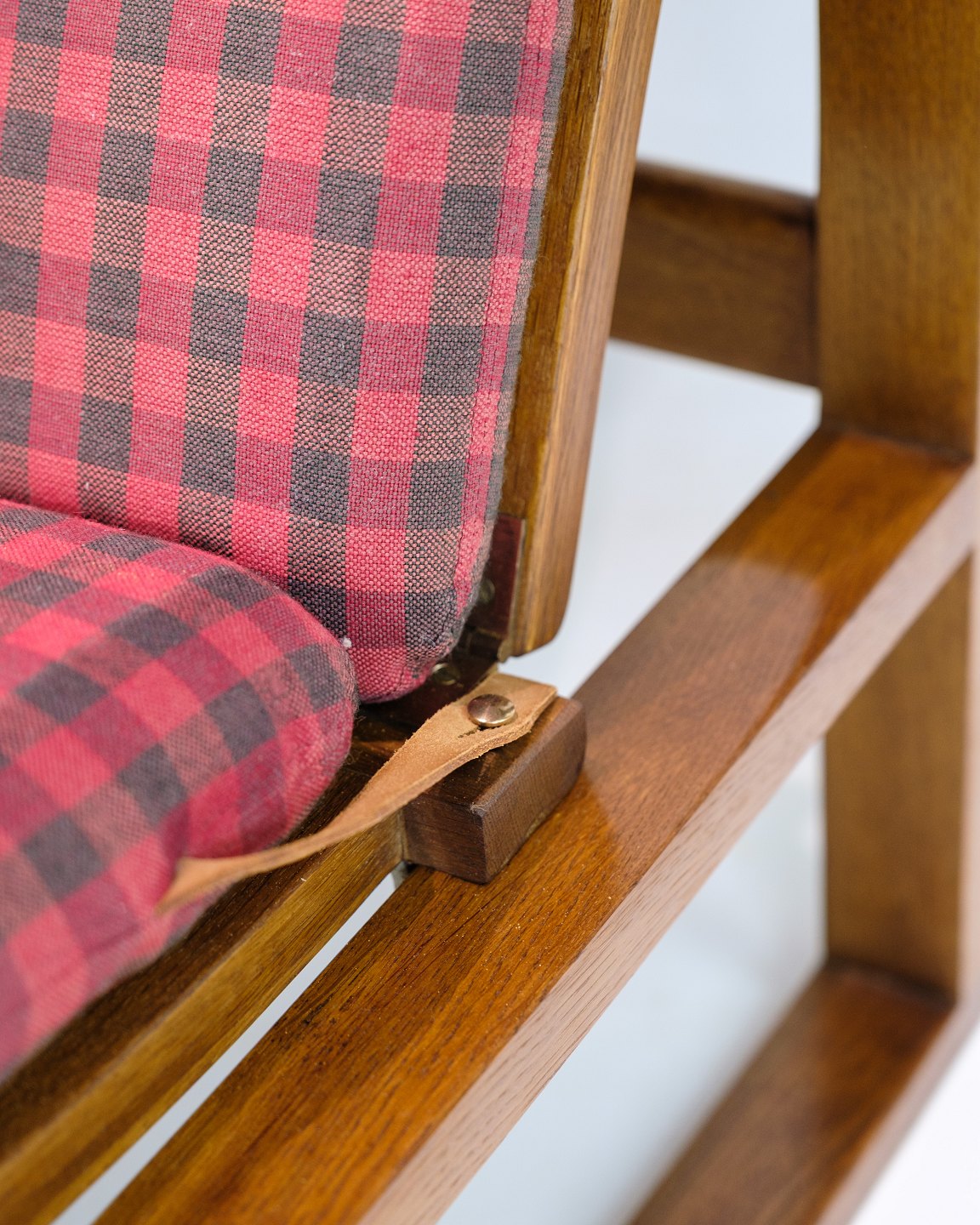 Original Slædestol, model BM2254, designet af Børge Mogensen i 1958 og udført af Fredericia Stolefabrik. Stolen er lavet i olieret egetræ med tappede samlinger og løse hynder i rødt/ternet stof samt nakkepude.