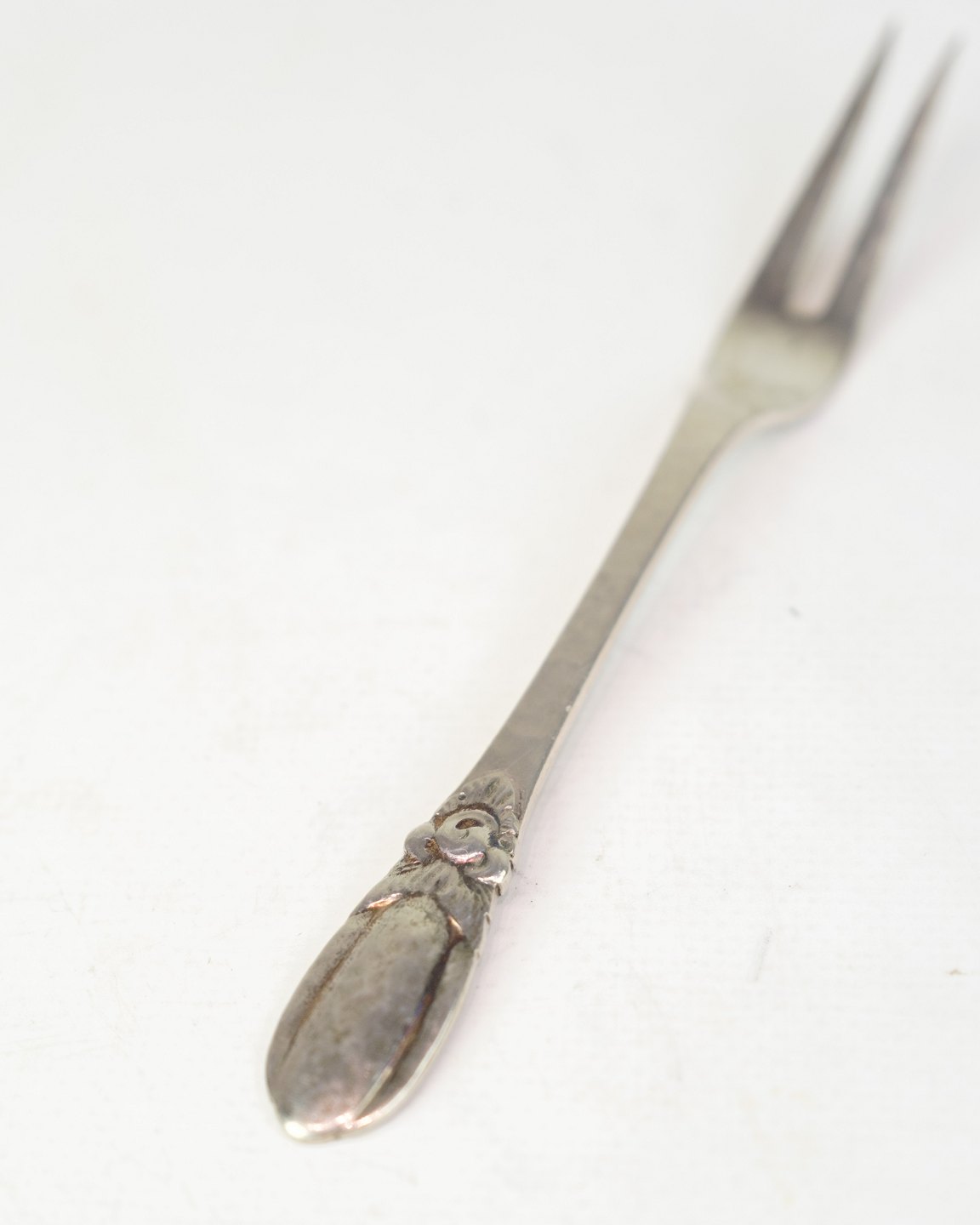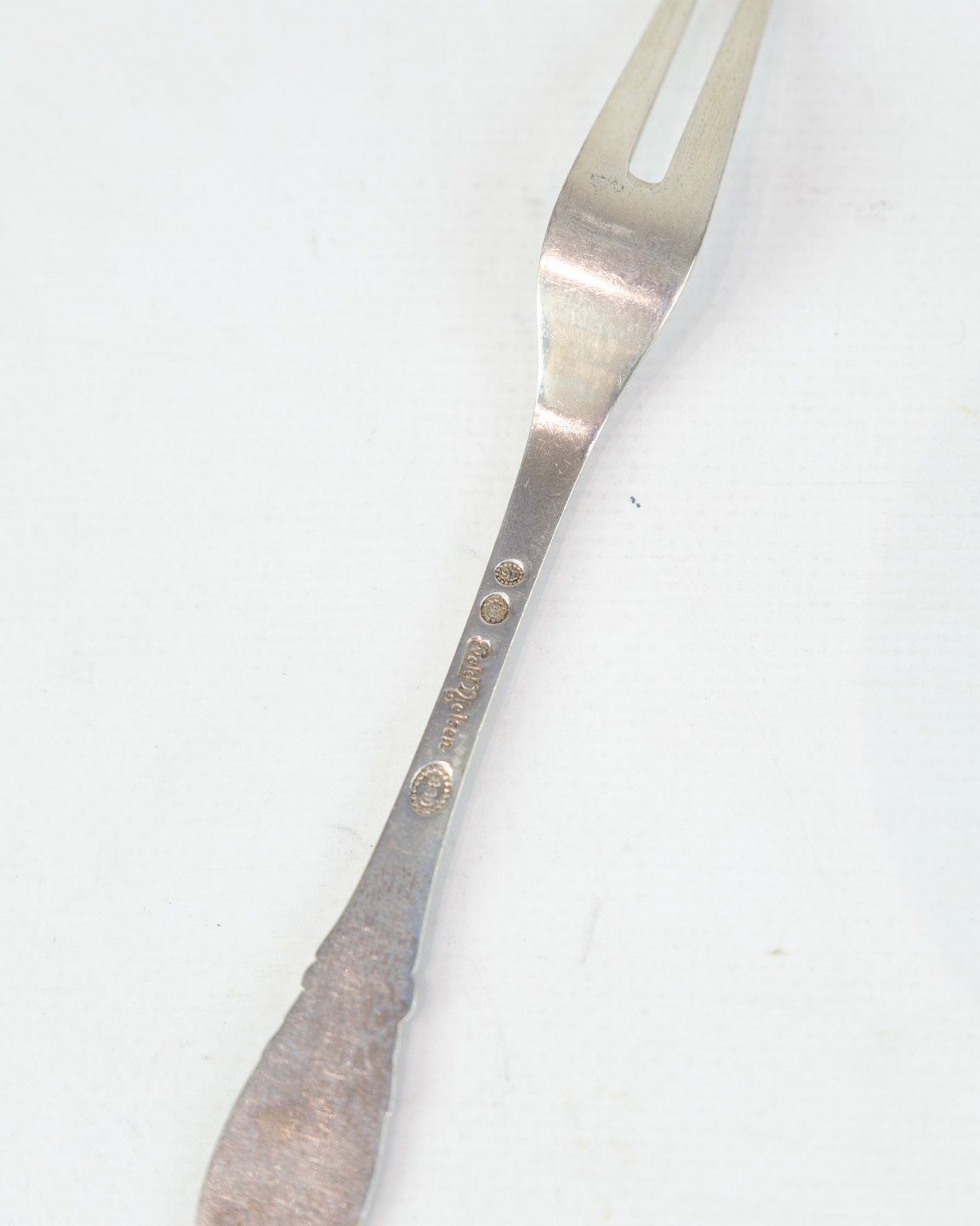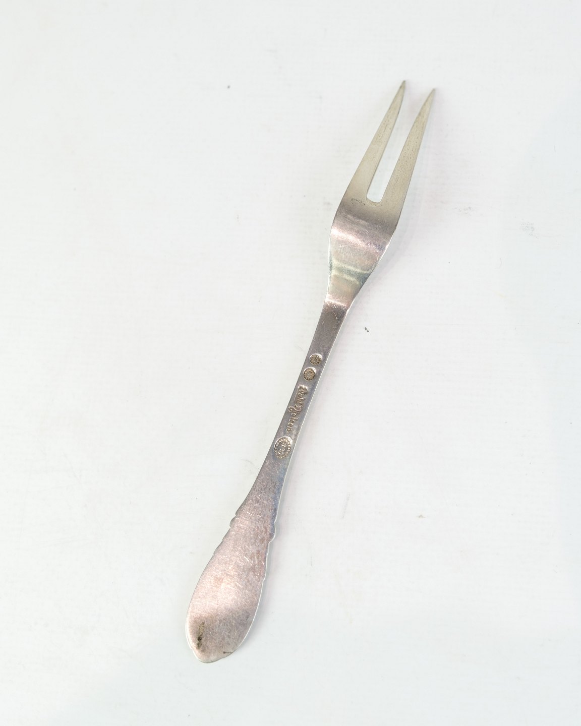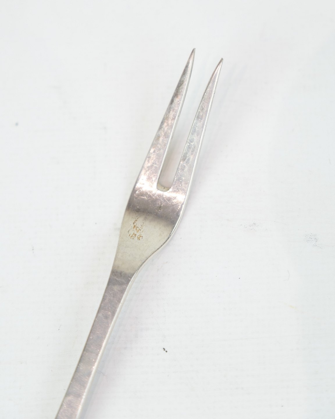 Evald Nielsen pålægsgaffel i ægte sølv. Hammerslået mønster, Model No. 16. Længde 15 cm. Klassisk dansk sølvarbejde.