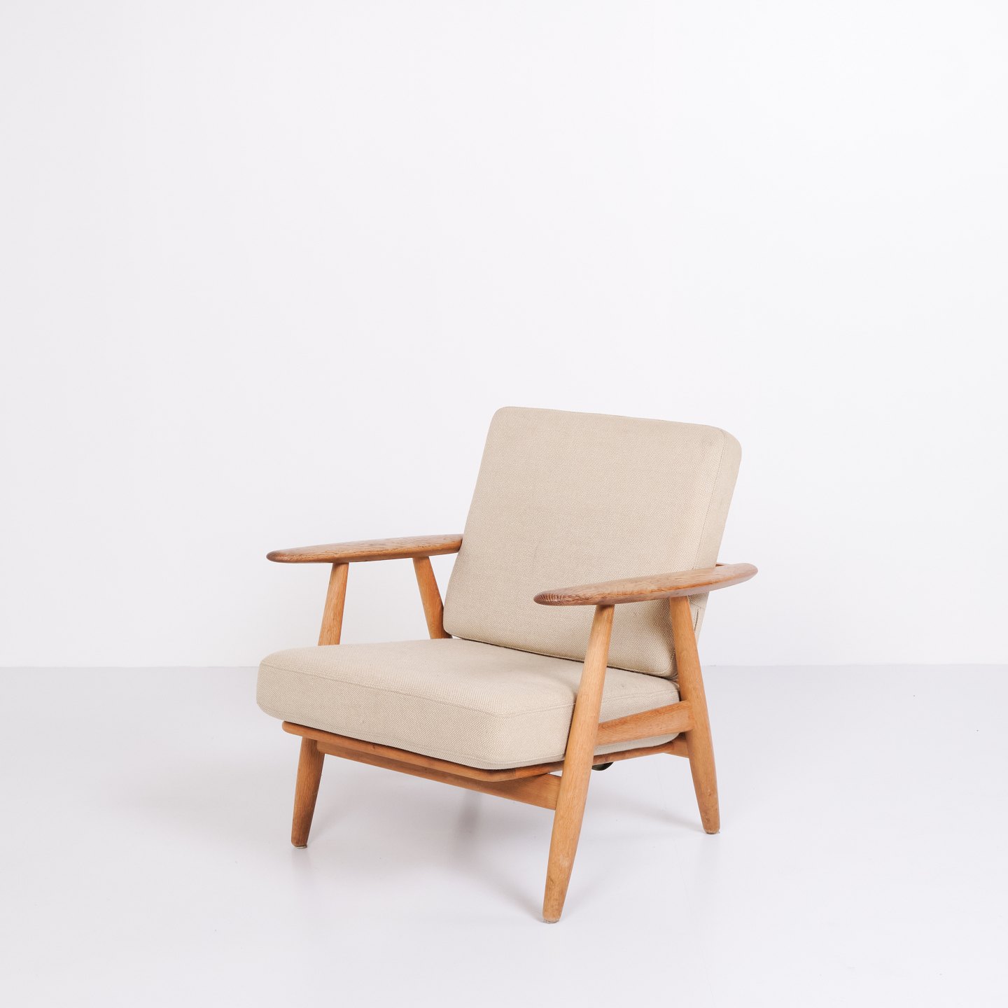 Sæt af to originale “Cigar” lænestole, model GE 240, designet af Hans J. Wegner og fremstillet af Getama i 1960’erne. Stolene er udført i massiv eg med polstring i lyst stof.