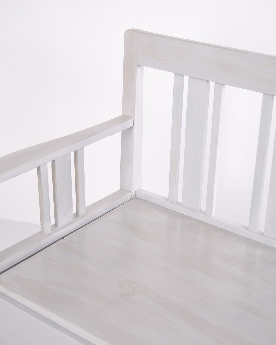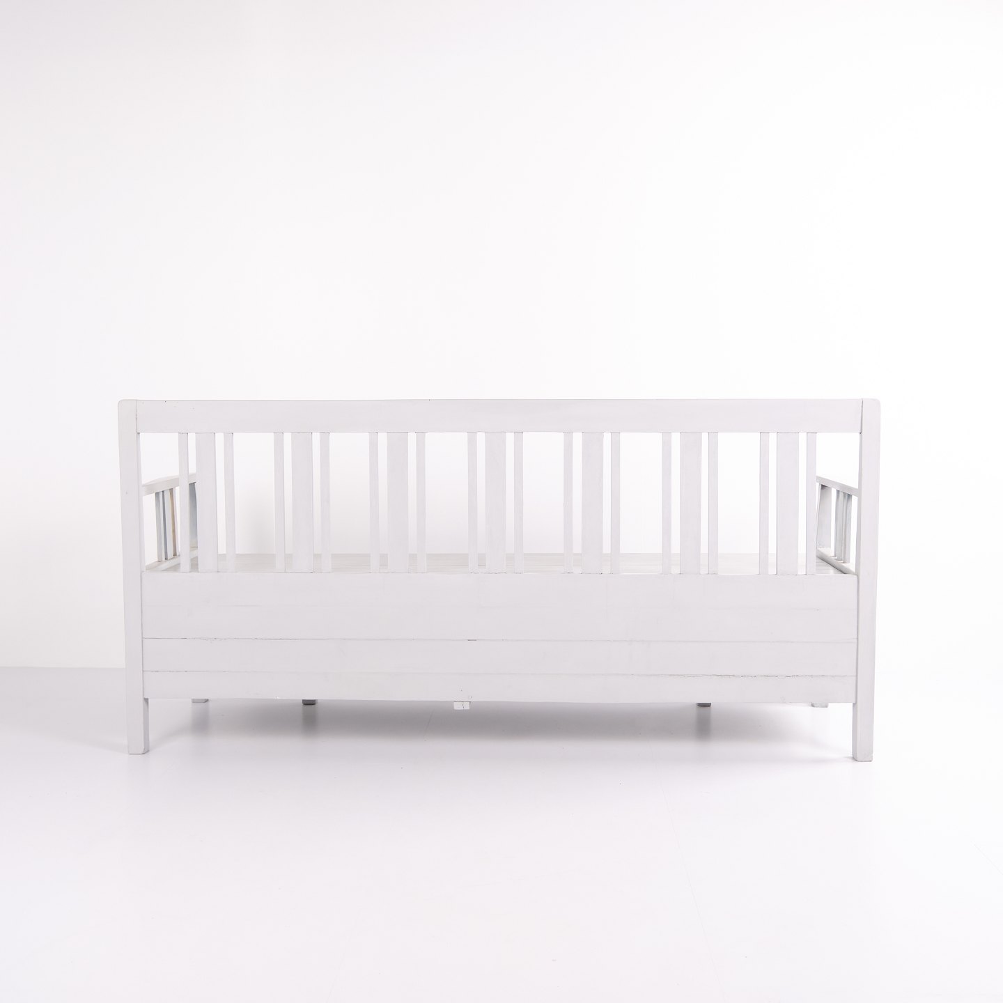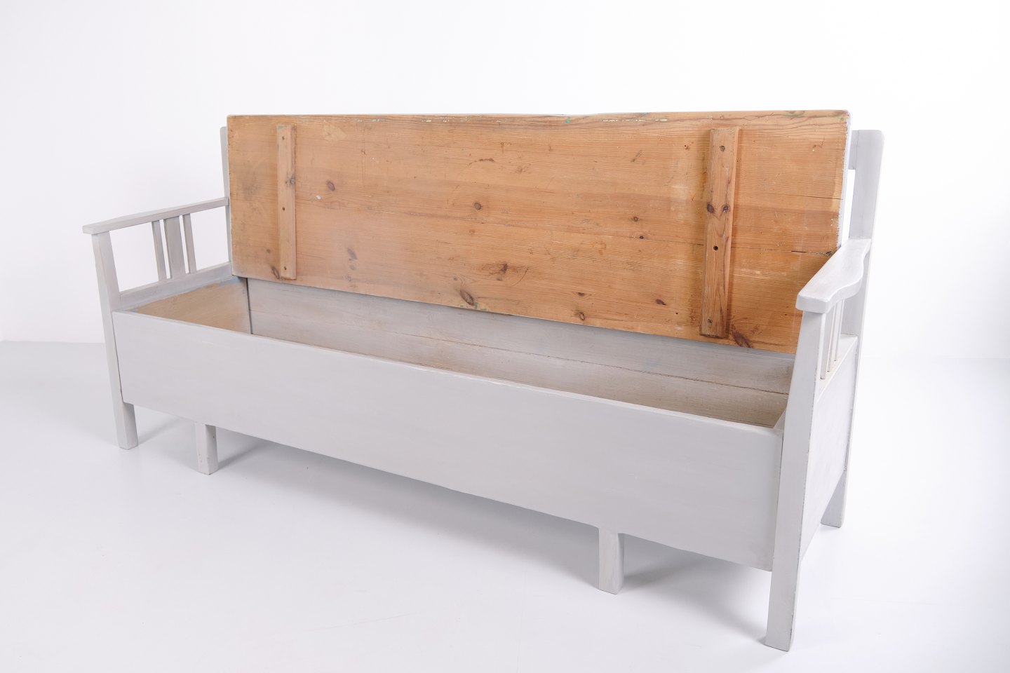 Svensk slagbænk fra ca. 1860’erne, udført i fyrretræ og gråmalet i senere tid. Klassisk skandinavisk møbel med dekorative bemalinger og praktisk sidde- og opbevaringsfunktion. Et solidt antikt stykke med tidstypiske detaljer.