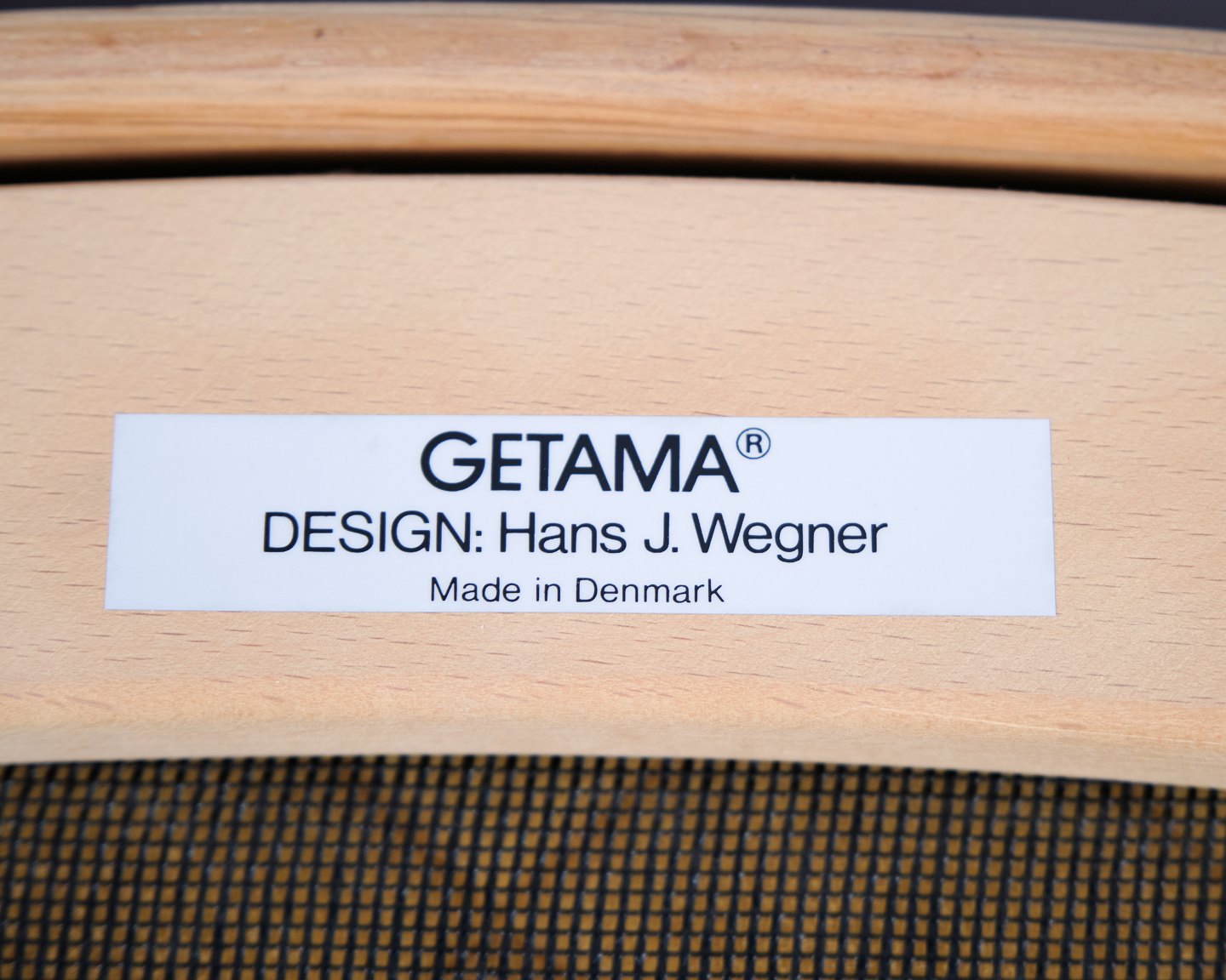 Lænestol model GE 284 designet af Hans J. Wegner og fremstillet af Getama. Udført med stel i massivt egetræ og løse hynder betrukket med blå uld. Klassisk Wegner-design med god siddekomfort og en kompakt form, der passer i både moderne og traditionelle indretninger.