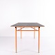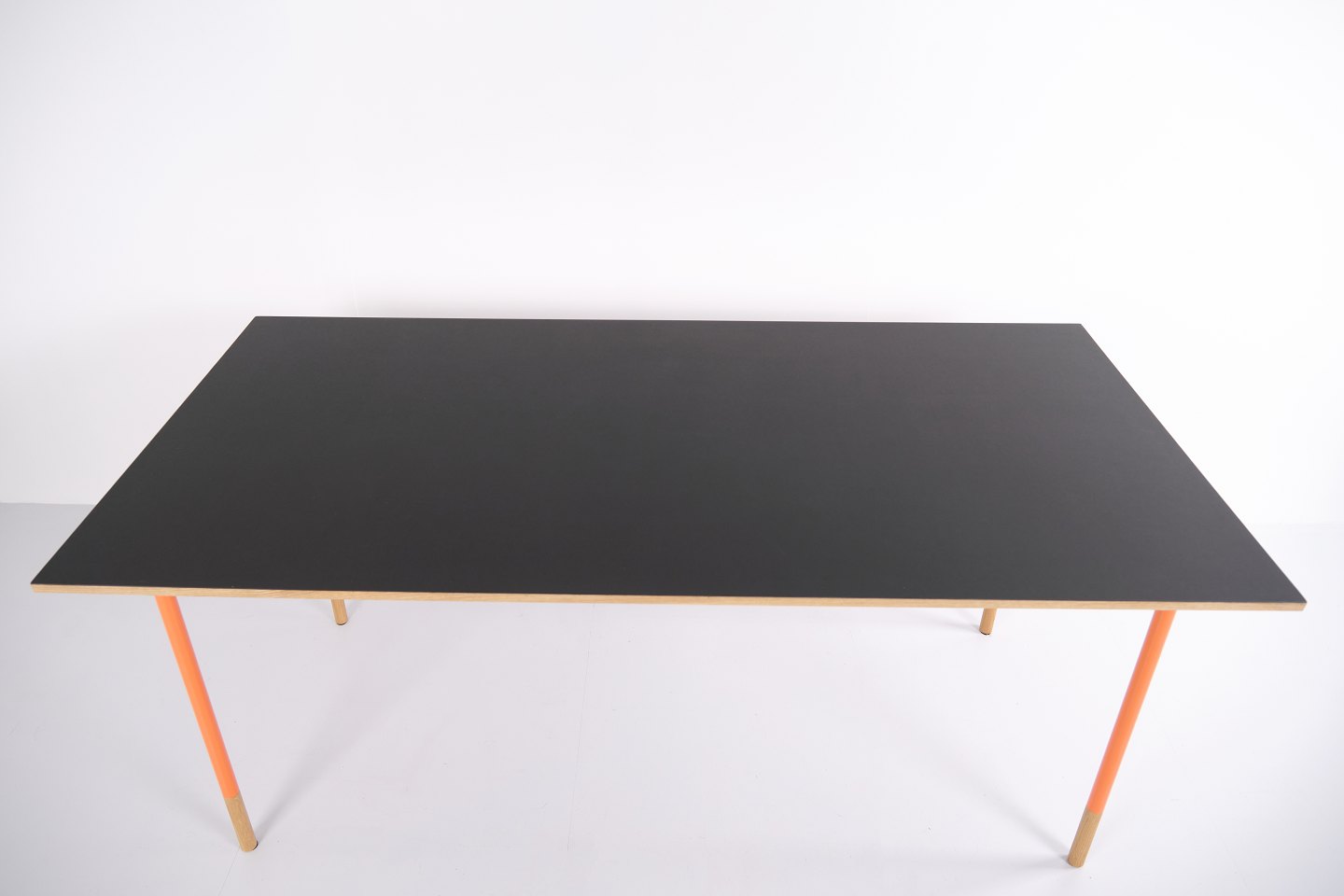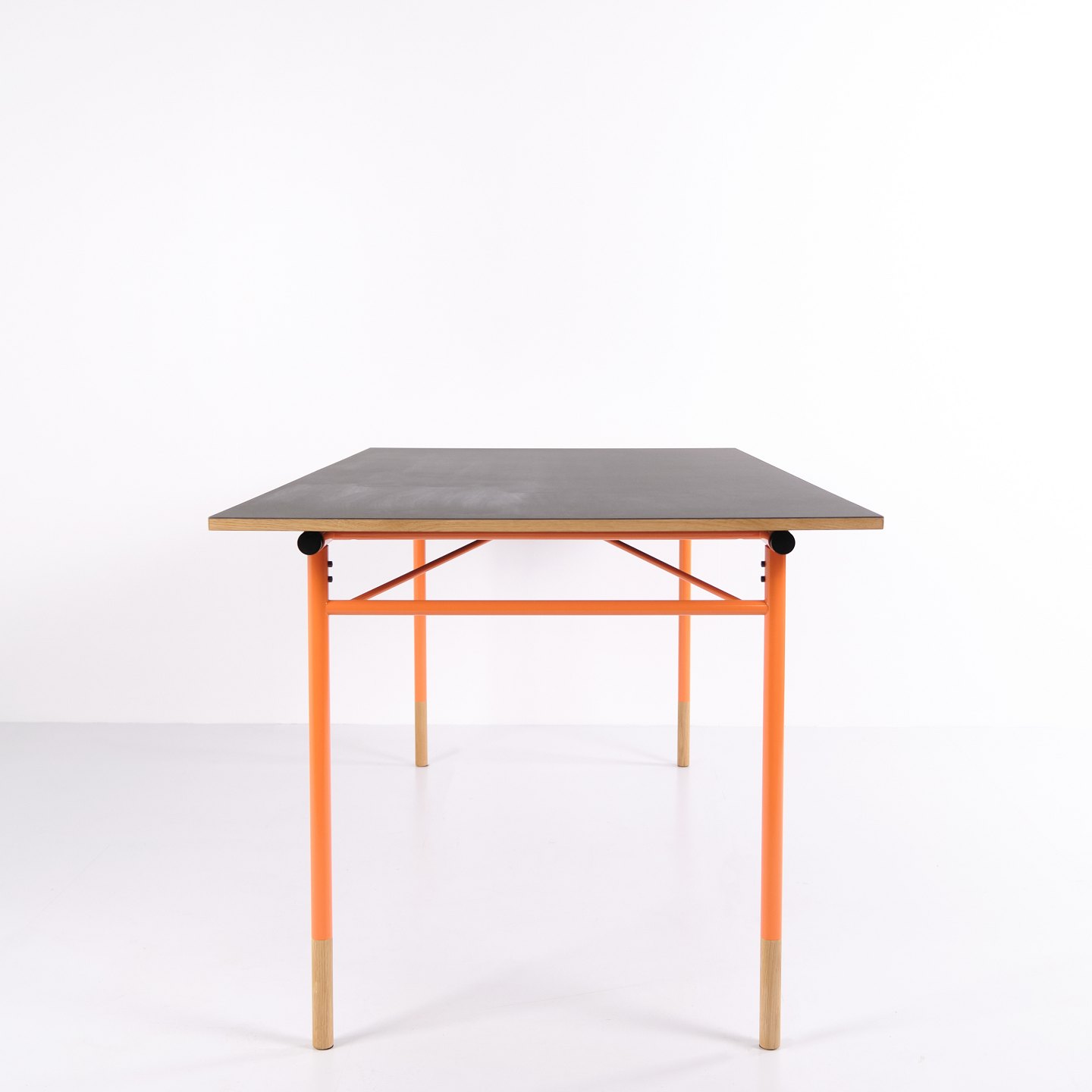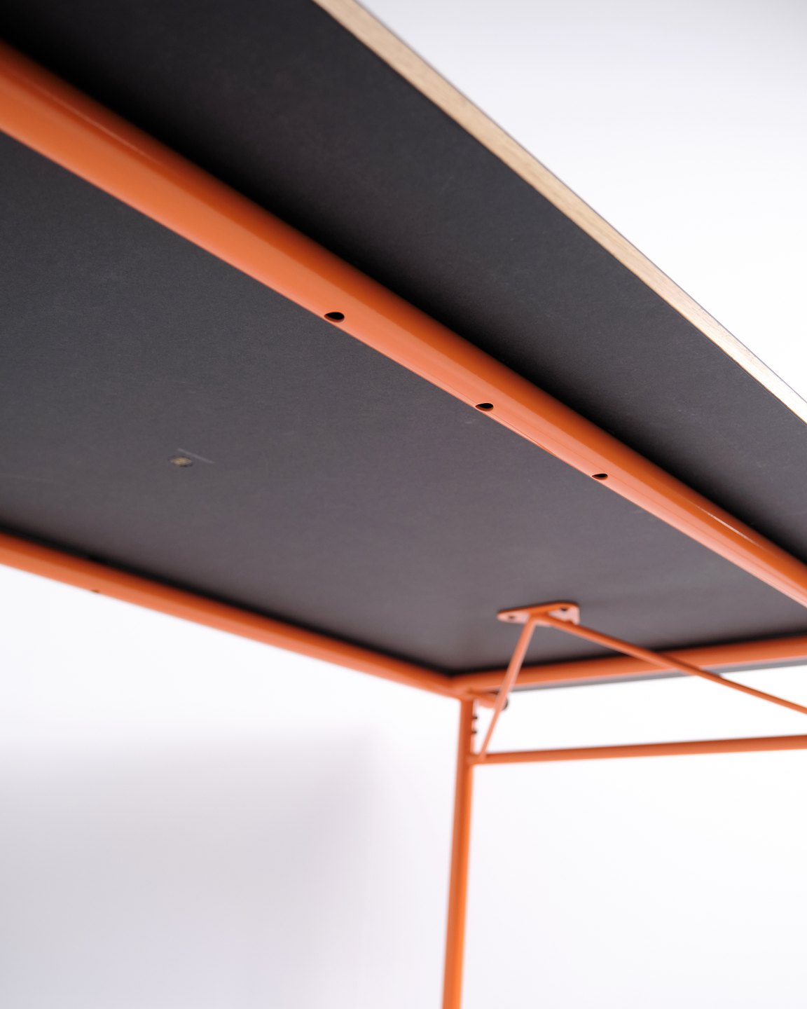 — Materials: Grey linoleum, oregon pine edges, orange-lacquered steel legs