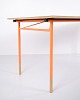 Nyhavn Dining table designed by Finn Juhl in 1953 and produced by House of Finn Juhl in 2015. The tabletop is finished in grey linoleum with oregon pine edges, supported by orange-lacquered steel legs with wooden feet. Includes two extension leaves of 54 cm each. A classic Finn Juhl design with characteristic materials and a light, elegant expression.