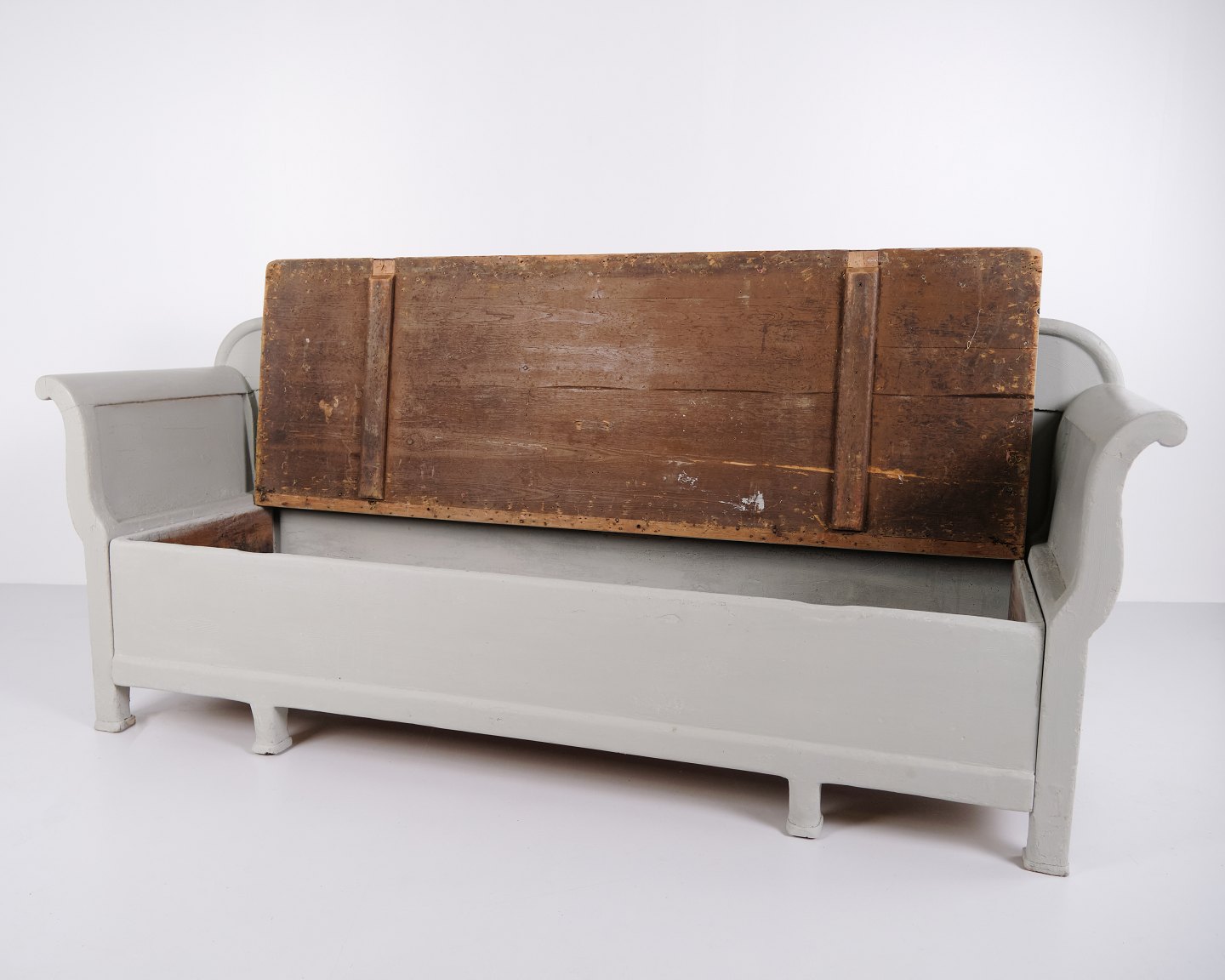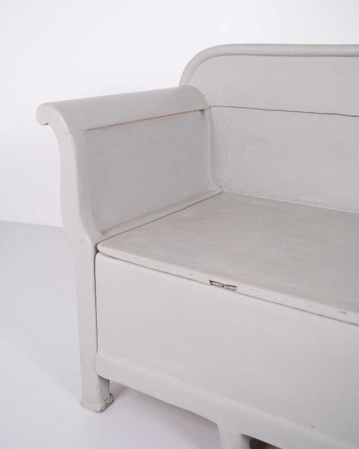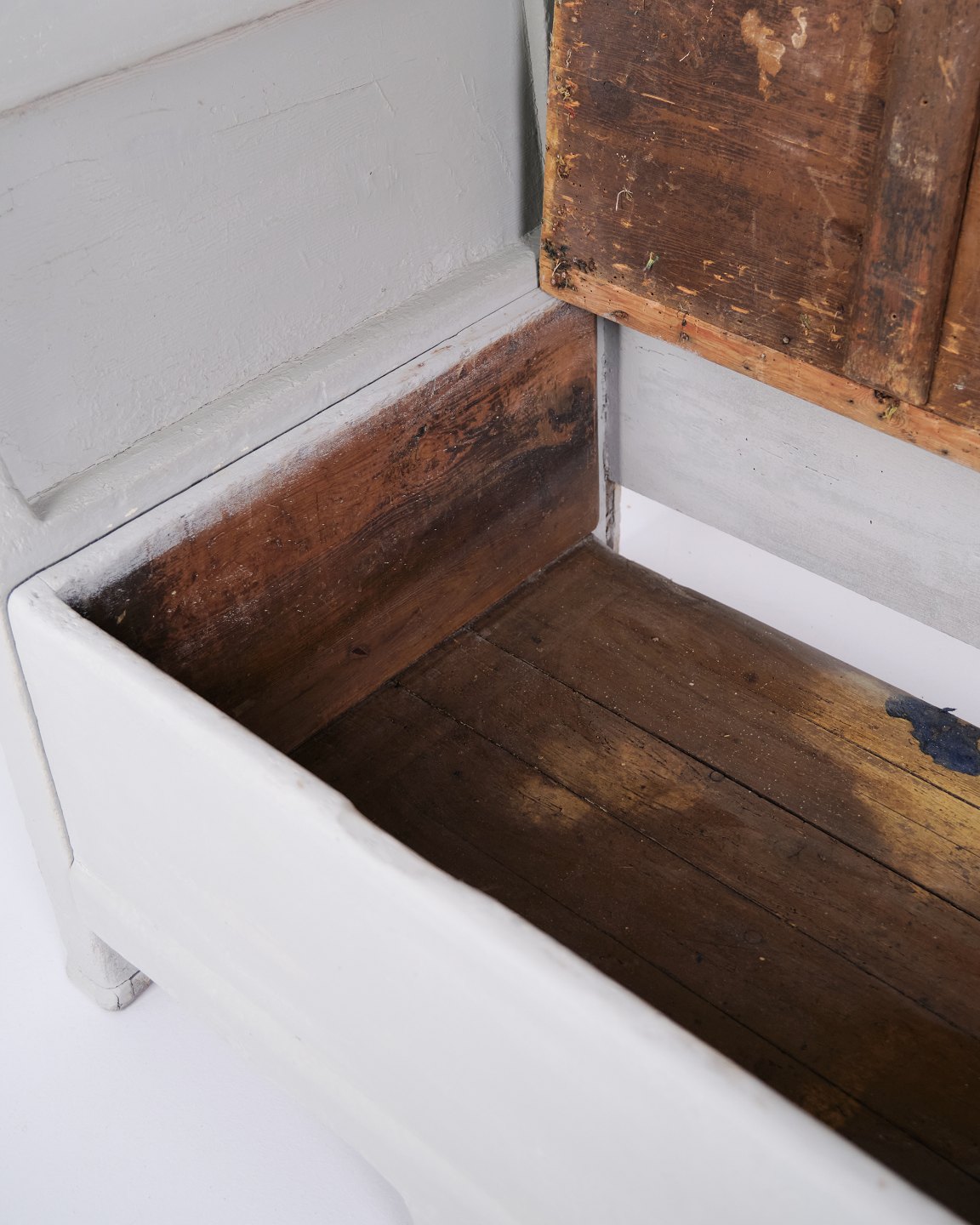 Antik slagbænk 1890’erne i gråmalet fyrretræ med opbevaring. Antik opbevaringsbænk 1800-tallet.