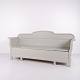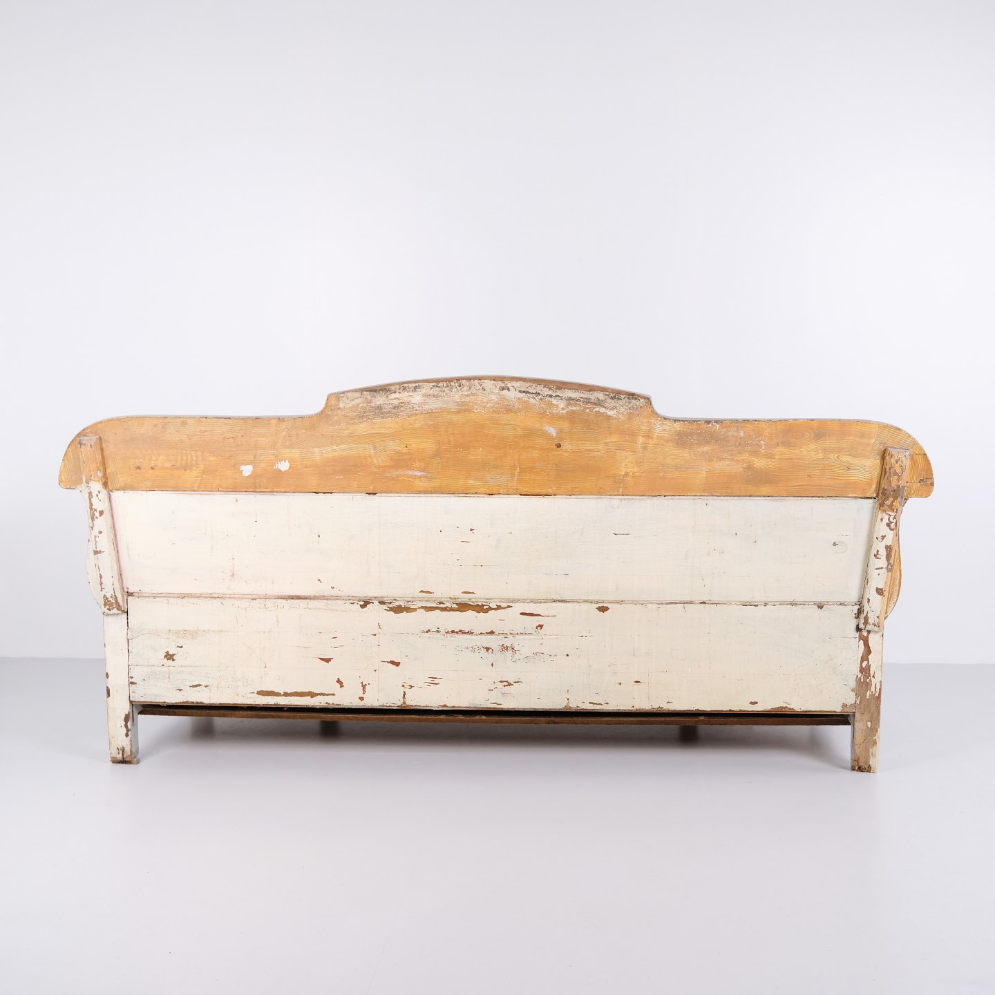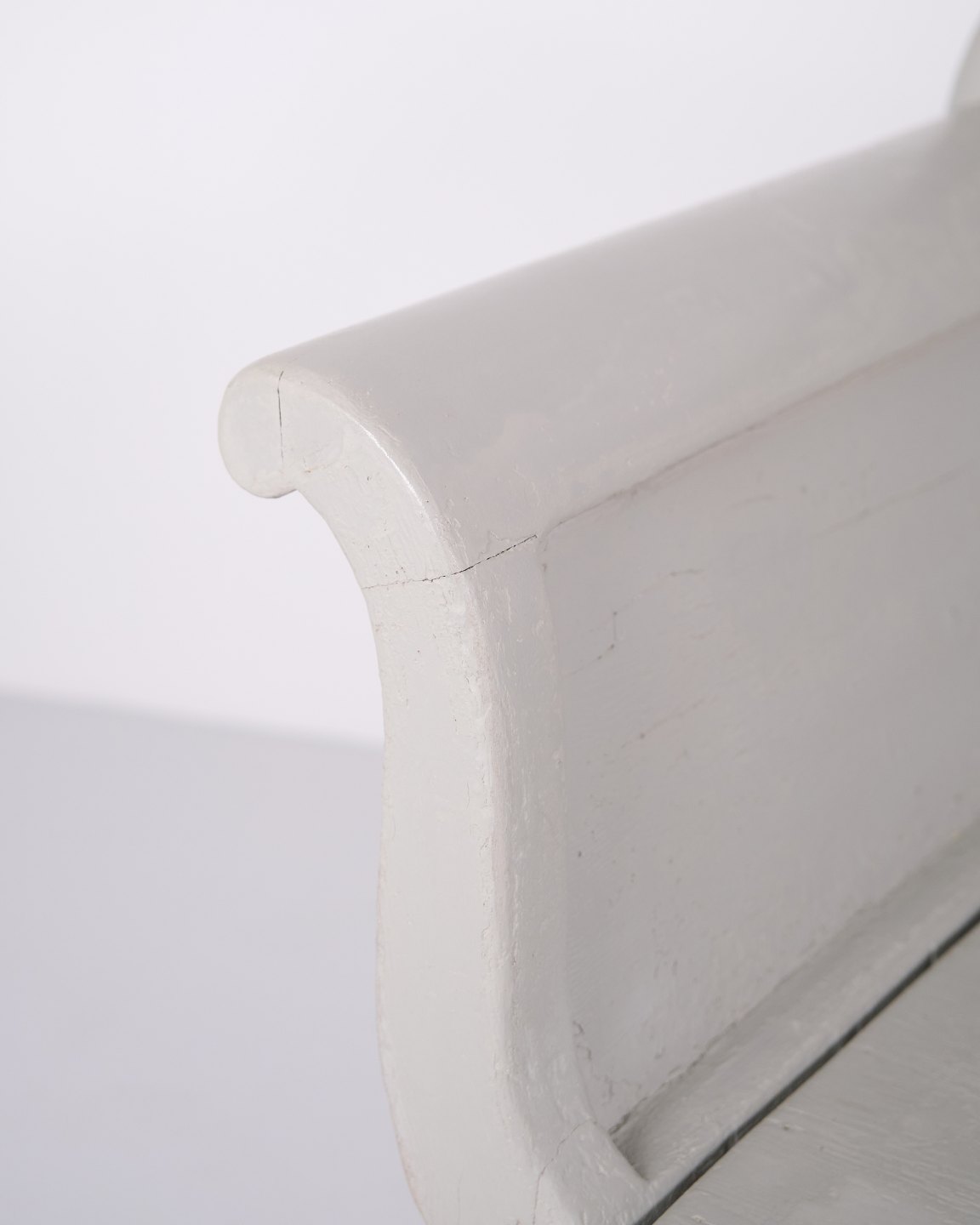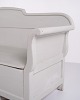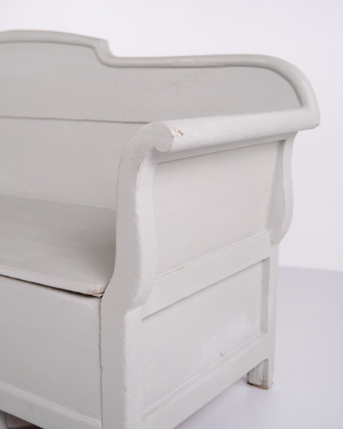 Antik slagbænk 1890’erne i gråmalet fyrretræ med opbevaring. Antik opbevaringsbænk 1800-tallet.