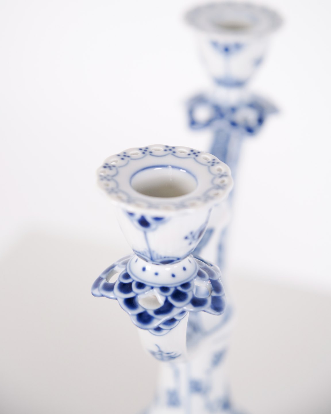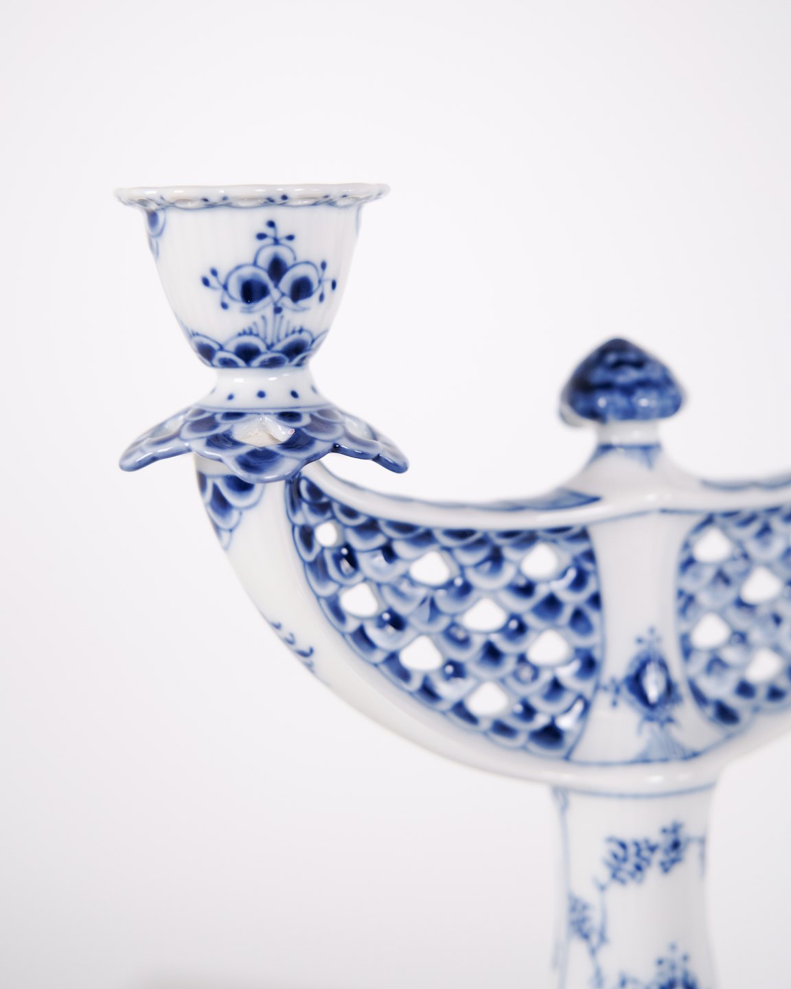 To-armet lysestage i musselmalet helblonde porcelæn, model 1169, produceret af Royal Copenhagen. Lysestagen er udført i håndmalet porcelæn med det klassiske helblonde-mønster, kendetegnet ved gennemgående gennembrudt bort og detaljeret underglasurdekoration. Modellen er produceret som 1. sortering og indgår i Royal Copenhagens traditionelle servicenproduktion.