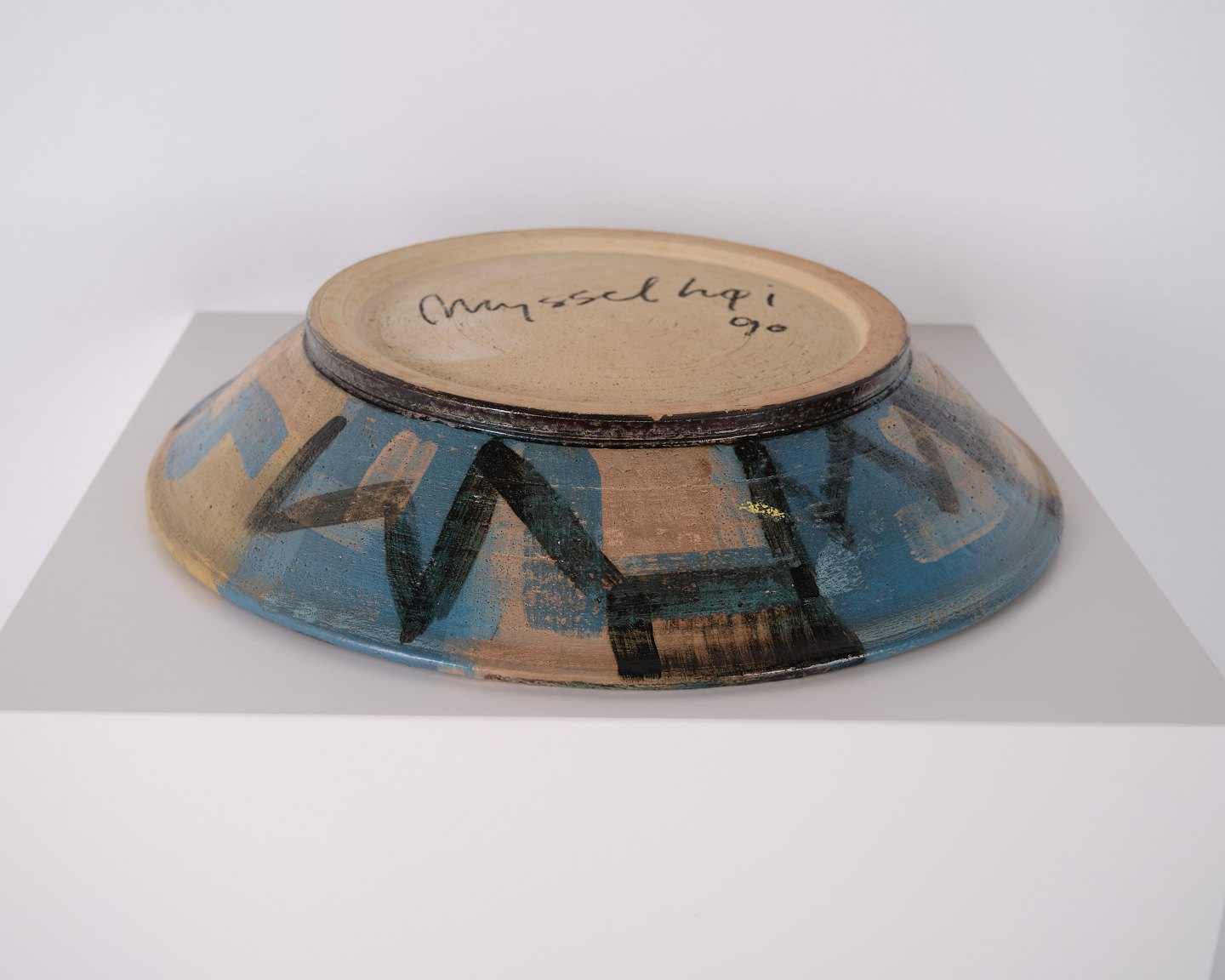 Unique ceramic dish executed and signed by the Danish ceramic artist Per Weiss (b. 1953) in 1990. The dish is decorated in colorful tones with a motif of Mysselhøj, an ancient burial mound located about 1 km west of Gammel Lejre near Roskilde, where both Per and Lene Weiss previously lived. The motif is inspired by the historic landscape surrounding Lejre and is executed as a unique artistic piece.