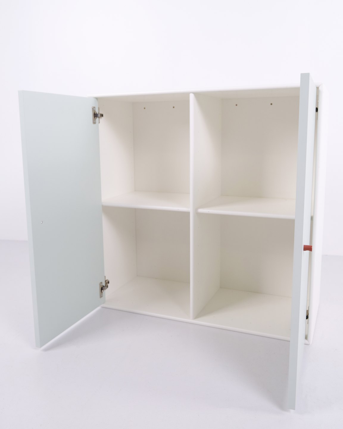 Montana skabmodul fra det modulære Montana System designet af Peter J. Lassen. Udført i lakeret MDF med hvid korpus, to mintgrønne låger og brune greb. Montana blev grundlagt i 1982 og er kendt for fleksible opbevaringsmoduler produceret i Danmark. Modellen kan anvendes som vægskab, entrémøbel, badeværelsesskab eller del af større Montana reolsystem. Montana fremstilles fortsat på Fyn og er kendt for høj finish samt stort farveudvalg.