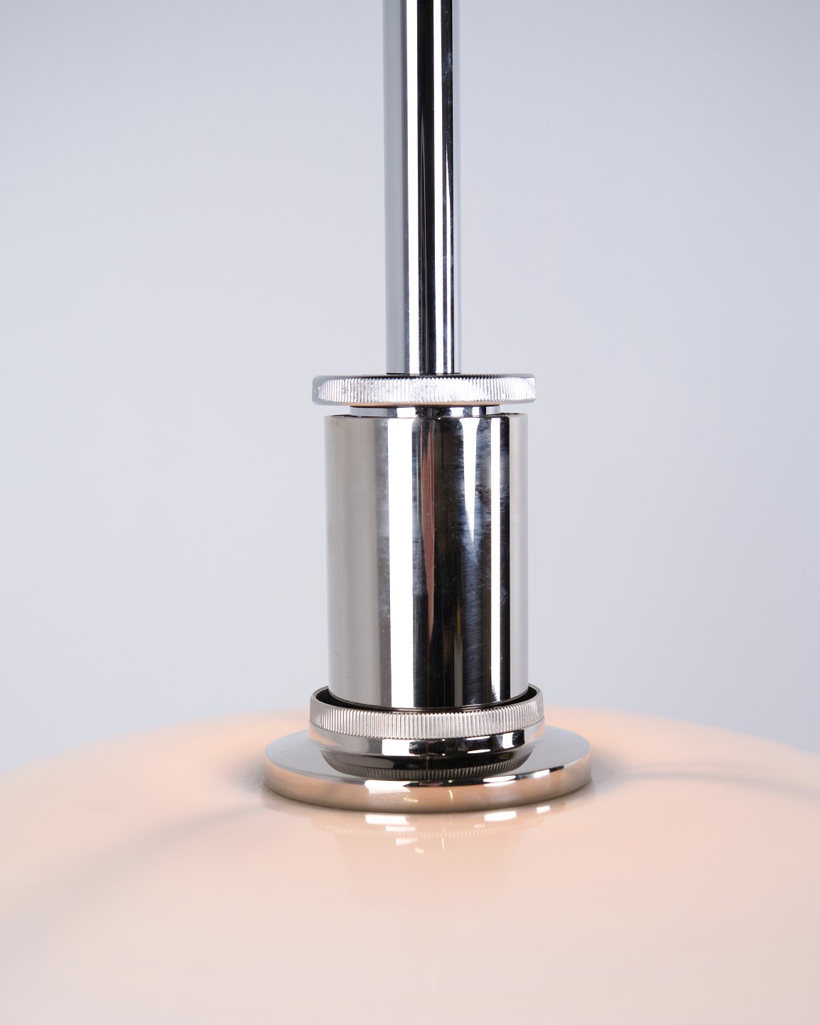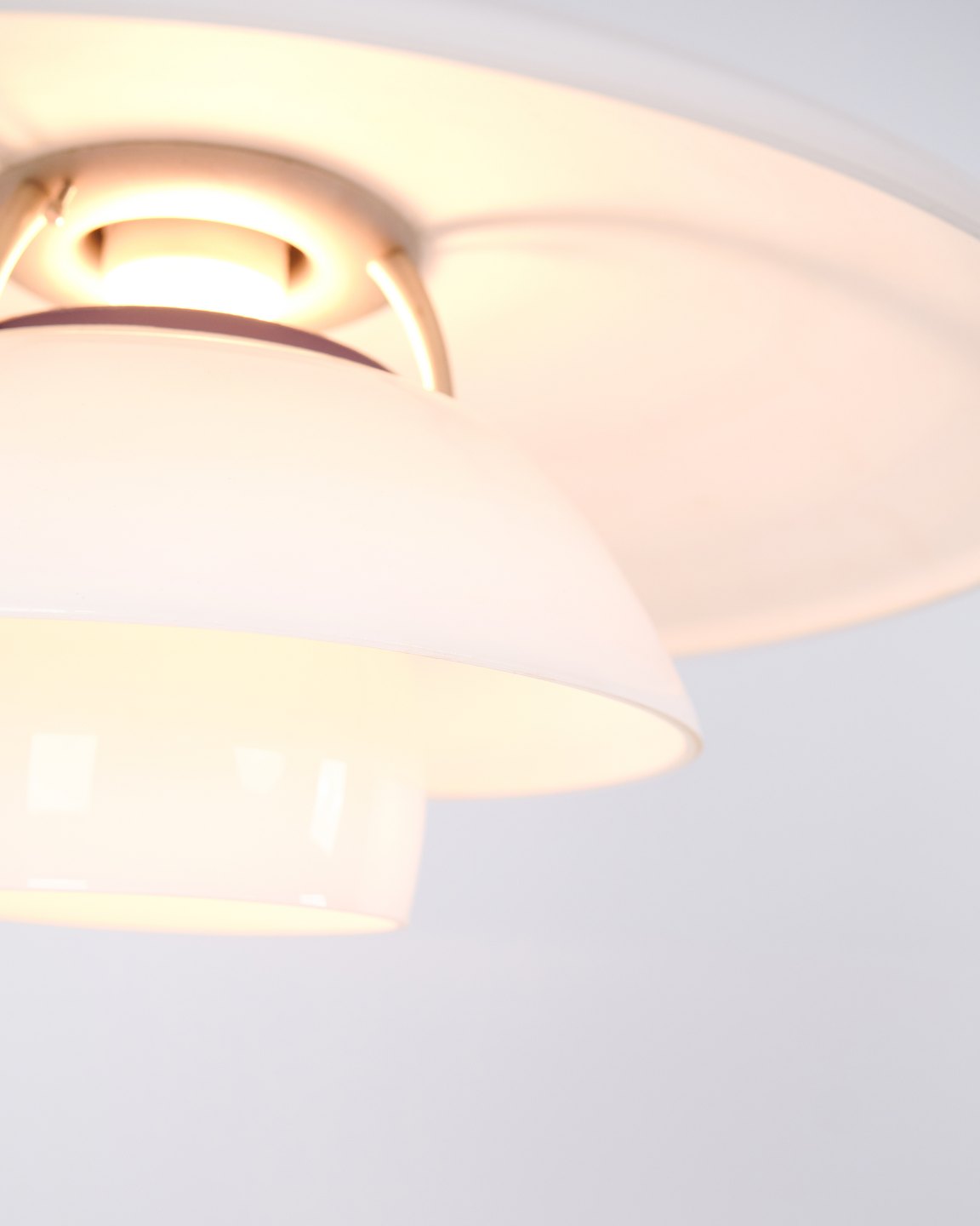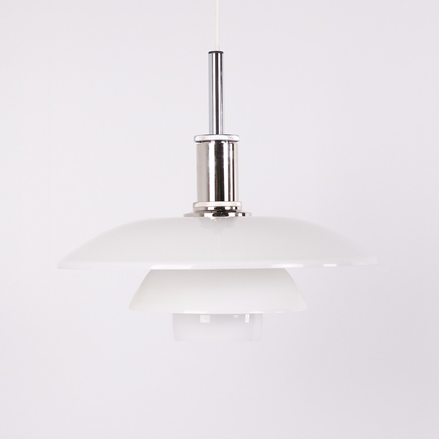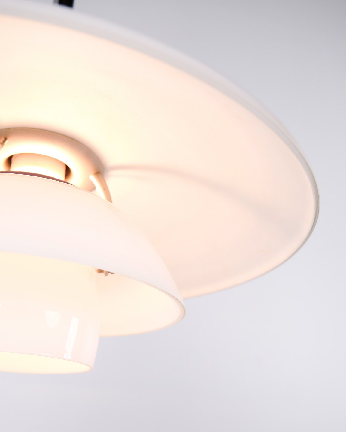 PH 4½-4 pendel designet af Poul Henningsen for Louis Poulsen. Lampen er udført med mundblæste treskærme i hvidt opalglas og kromophæng. Modellen har en overskærm på ca. 45 cm og anvender de nedre skærme fra PH 4/4-serien, udviklet for at give bredere lysfordeling ved lav ophængning over spisebord eller bordflade. Den nuværende version blev introduceret i 1980 og er en del af PH-seriens ikoniske blændfrie belysningssystem.