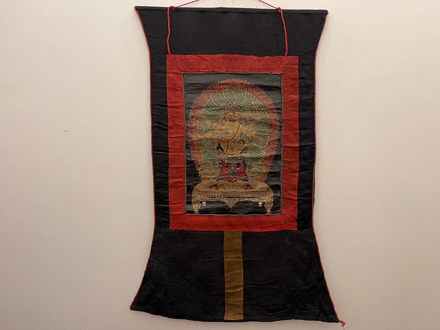 Asian, Buddhist Thangka painting, mounted in hand-sewn cloth of cotton and silk, 20th century