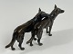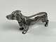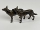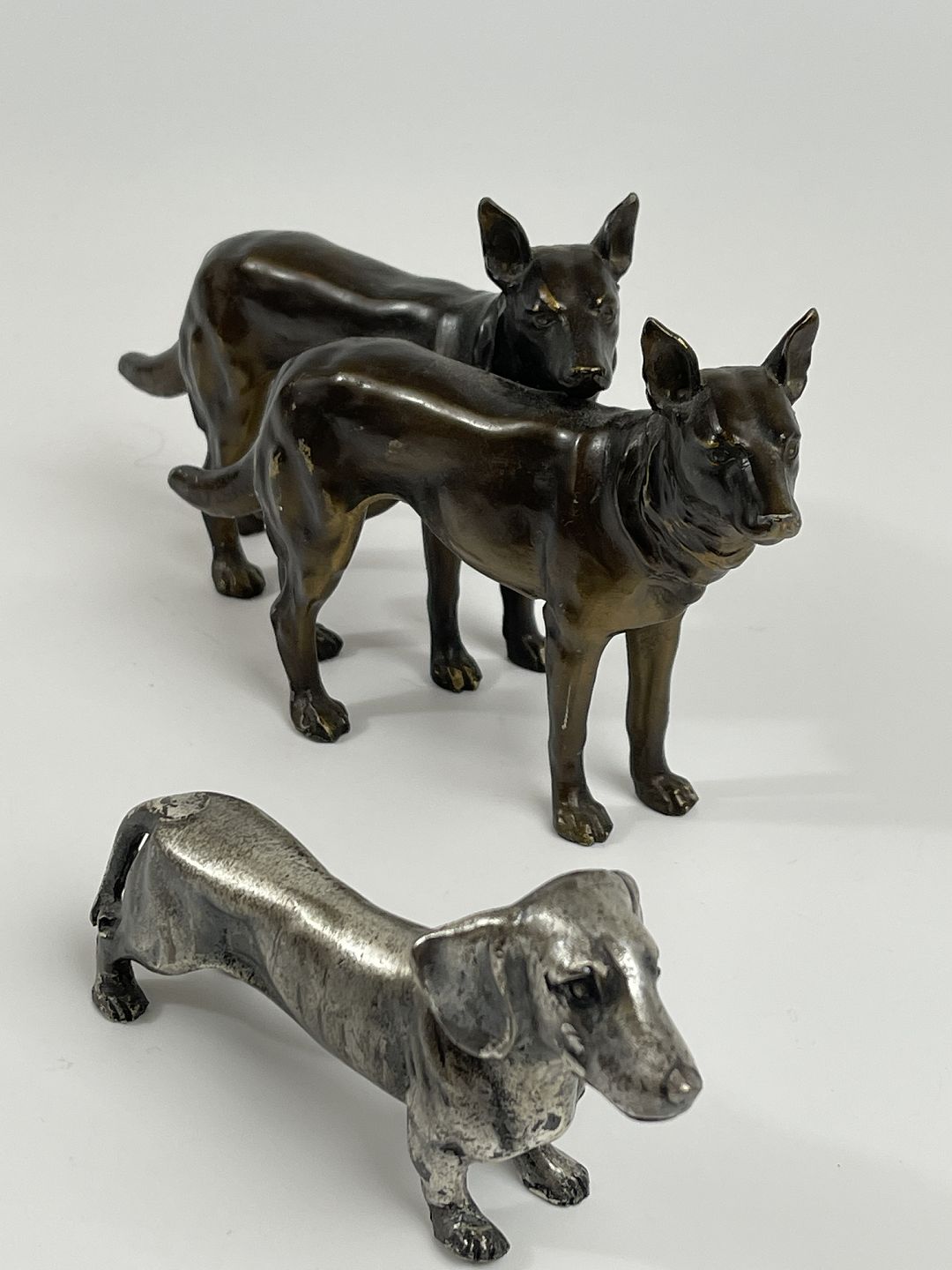 Hunde-figurer af metal. Vintage fra det 20. århundrede. Gravhund i "hvidt" metal (solgt), schæferhunde i mørkt. Prisen er per stk. Bemærk, at de to schæferhunde hænger sammen og er 1 figur.