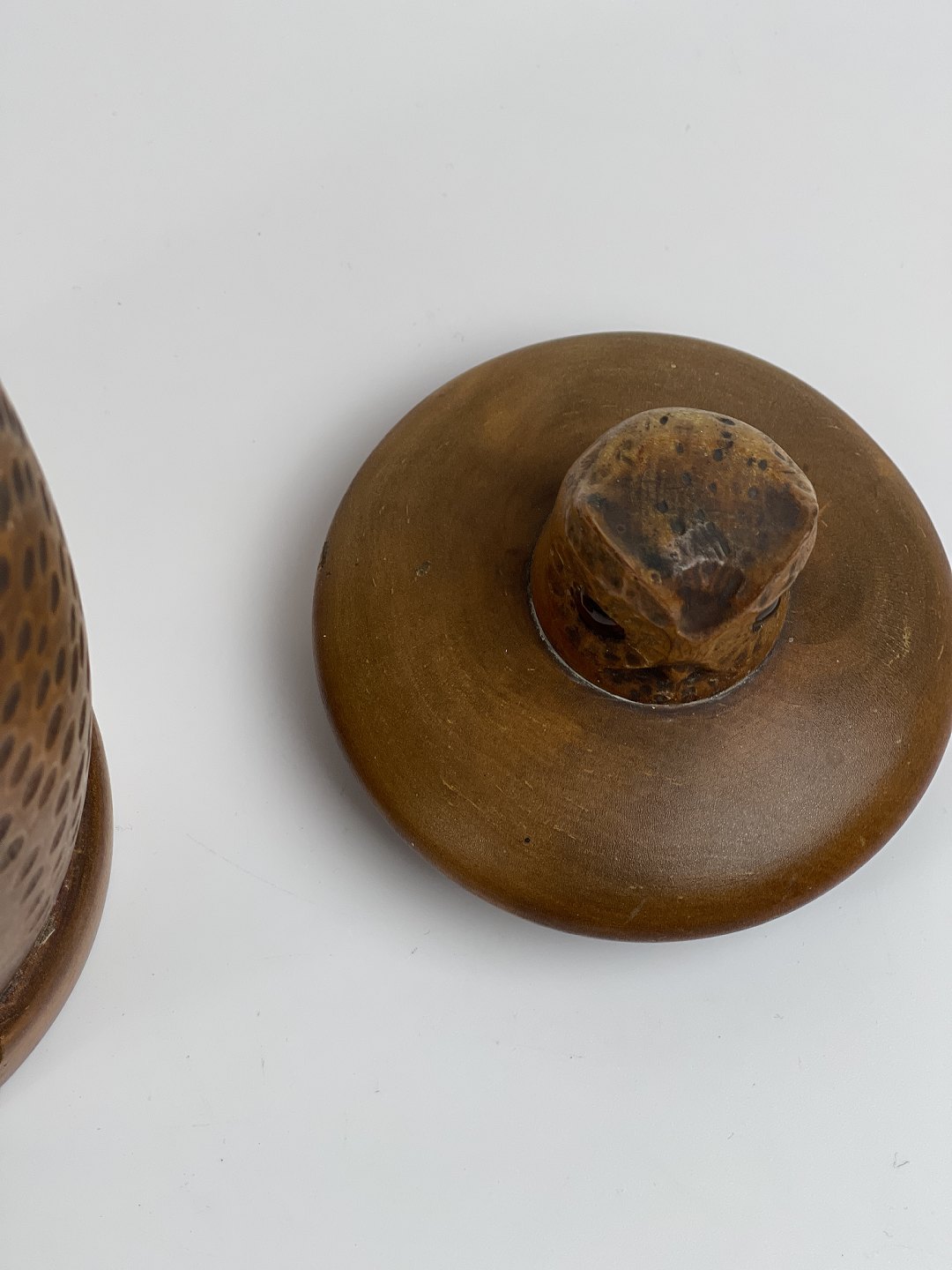 Håndlavet tobakskrukke / lågkrukke i træ med udskåret ugle i relief. Mindre uglehoved er udskåret og påsat som håndtag til låget. Begge ugler har glasøjne. 1 halvdel af det 20. århundrede.