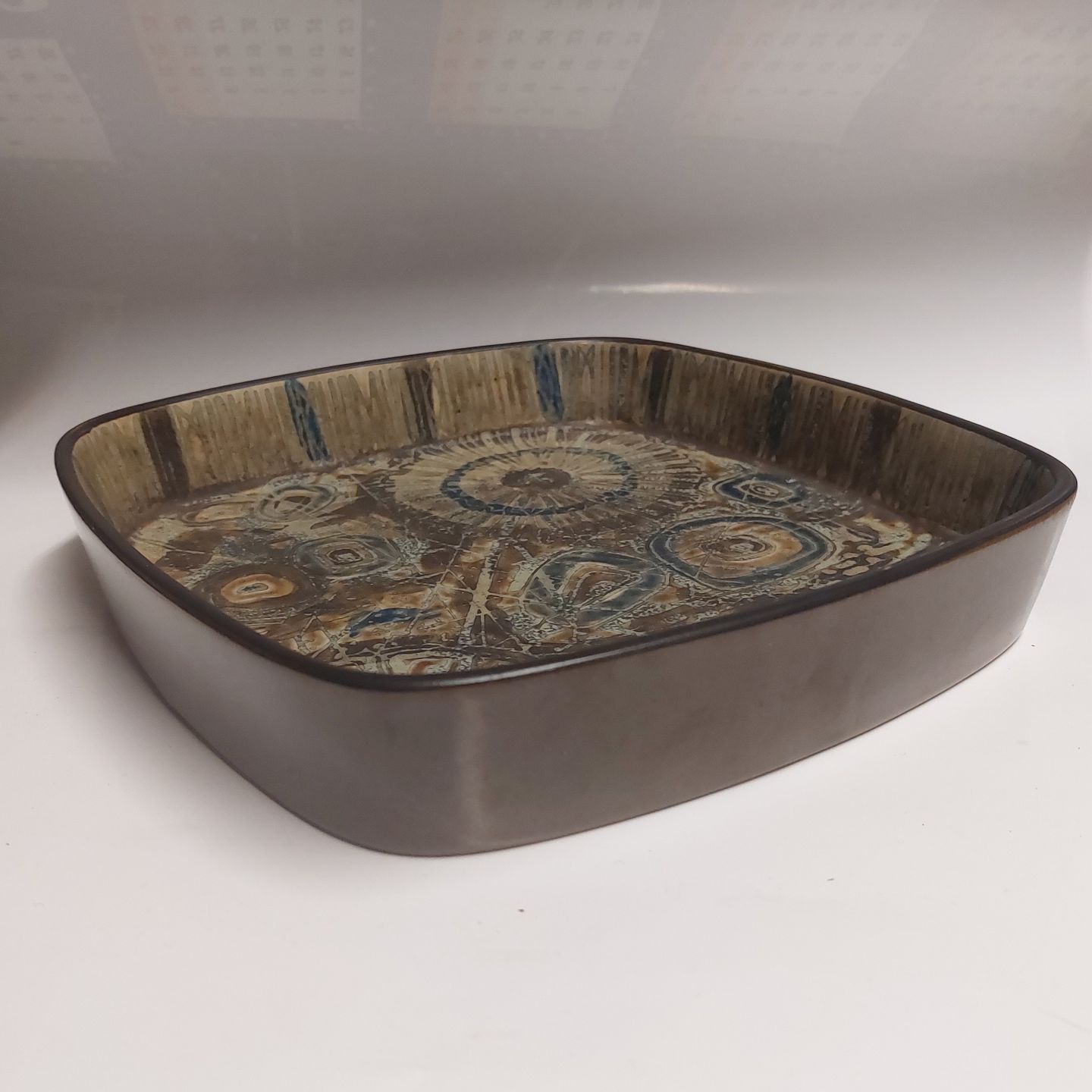 Brown Royal Copenhagen baca dish In ceramic designed by Nils Thorsson. Factory first quality. Appears in good condition with no damage or repairs. The factory mark on the bottom together with the artist's signature. Model number 2884. Measurements: H. 4 cm and 22 x 22 cm