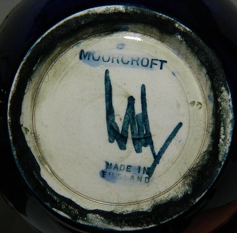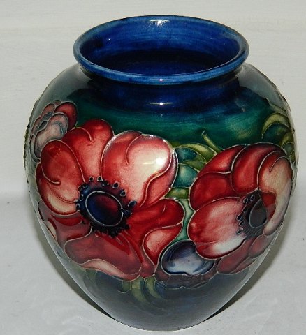 Blå vase i keramik fra Moorcroft, England. Dekoreret med blomster. I perfekt stand. Fabriksmærket på bunden. 13 cm høj.