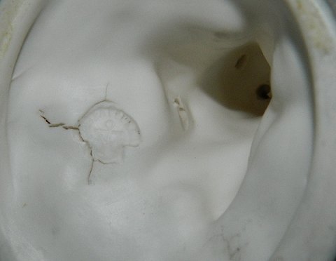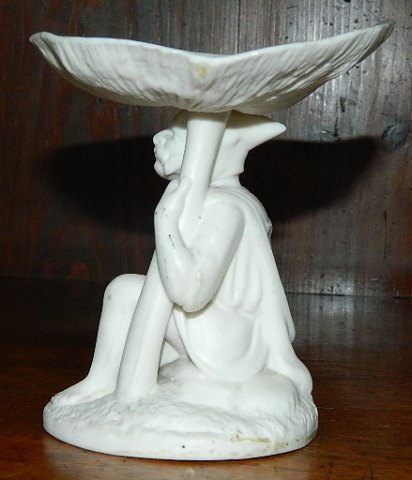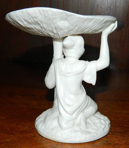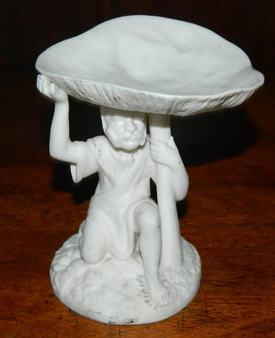 Figur i bisquit af nisse fra Gustavsberg, Sverige. Fremstillet omkring 1900. Nissen sidder under en svamp der fungerer som skål. Denne er glaseret i bunden. Fremstår i perfekt stand. Fabriksmærket på undersiden. 12 cm høj