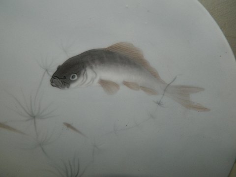 Platte med motiv af torsk ! Fremstillet for Royal Copenhagen i skønvirkeperioden omkring 1900. I perfekt stand. 1. sortering. Fabriksmærket på bagsiden. 22½ cm i diameter.