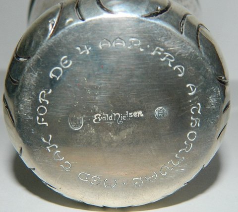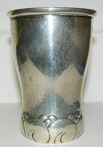 Tidligt bæger i sølv med skønvirkedekorationer. Designet af sølvsmed Evald Nielsen (1879-1958). Fremstår i god stand uden skader, reparationer eller buler. Indgravering på bunden. 10½ cm høj