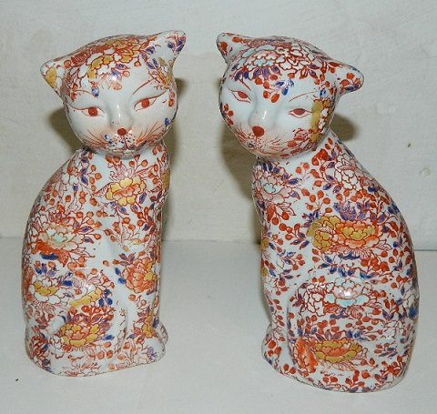 Par figurer af katte (Staffordshire-stil) i porcelæn fra Kina. Imari dekoration med blomster. Fremstillet omkring 1920 i Japan. Fabriksmærket på bunden. I perfekt stand. 18 cm høj.