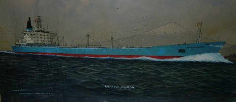Hagiwara: "Dorthe Mærsk", skibsportræt. Sign. T. Hagiwara, Yokohama Japan. Gouache på silke. Mål 31½ cm x 43 cm