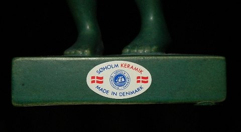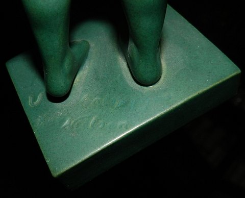 Grøn glaseret Kai Nielsen´s figur af “Venus Kalipygos”. Denne figur blev først produceret hos P. Ipsens Enke. Fra 1954 overgik produktionen keramikfabrikken Søholm i Rønne på Bornholm. Fabrikslabel på forsiden af soklen. Fabriksmærket på bunden. Kunstnersignatur på oversiden af soklen. I perfekt stand. 22 cm høj