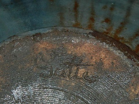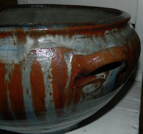 Stor skål med par hanke i keramik af Gutte Eriksen (1918-2008). Ribbet bemalet dekoration. Glaseret indenvendigt -og udenvendigt. Fremstår i perfekt stand. Signeret med Gutte på bunden. 19½ cm høj. Åbningsdiameter 29½ cm.