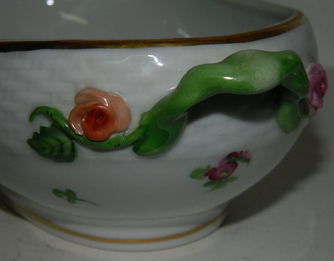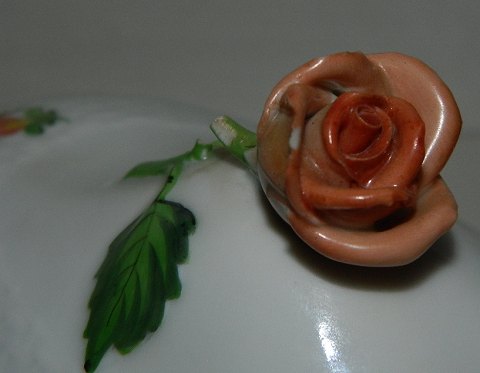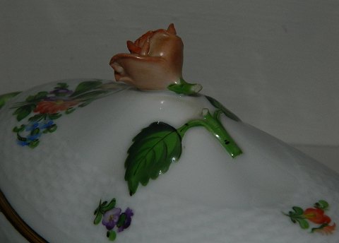 Lille terrin eller lågskål fra Herend fabrikken i Ungarn. Blomsten på låget mangler sin stilk. Ellers i god stand. Fabriksmærket på bunden. 18½ cm lang.