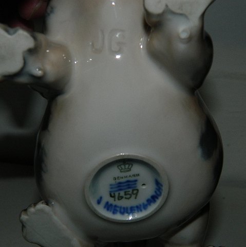 Figur i porcelæn af jaguar unge. Udført af billedhugger Jeanne Grut (f. 1927). Fremstår i god stand. 1. sortering. Har dog glasurfejl ved begge ører. Ubekendt navn anført under fabriksmærket. 8 cm høj og 22 cm lang.