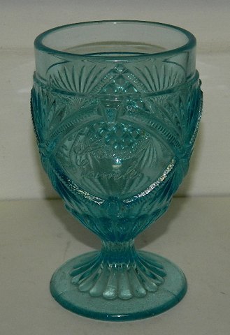 Blåt presset drikkeglas fra omkring 1920. Bærer teksten "Skaal Gamle" I perfekt stand. 13 cm højt.