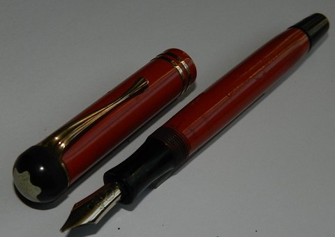 Gammel koralrød Original Simplo Montblanc Masterpiece nr. 20 fyldepen fra omkring 1930. Fremstår i god stand. Ny gummisæk skal indsættes før brug - Dette kan klares ved tillæg på kr. 300,00 til prisen. Ingen skader eller reparationer. Alle dele originale til denne model bl.a. 14 karat guld spids. 12½-13 cm lang (Lignende fyldepen købes)