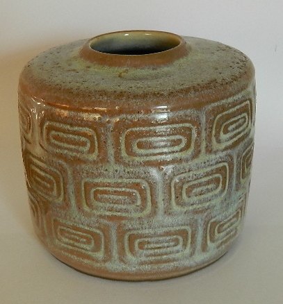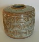 Vase i keramik med svag blålig glasur. Udført af Christian Poulsen (1911-1991) på eget værksted. Dekoreret med geometrisk mønster rundt om vasen. Fremstår i perfekt stand. Kunstnersignatur CHR. P. samt modelnummer på bunden. 11 cm høj og 12½ cm i diameter.