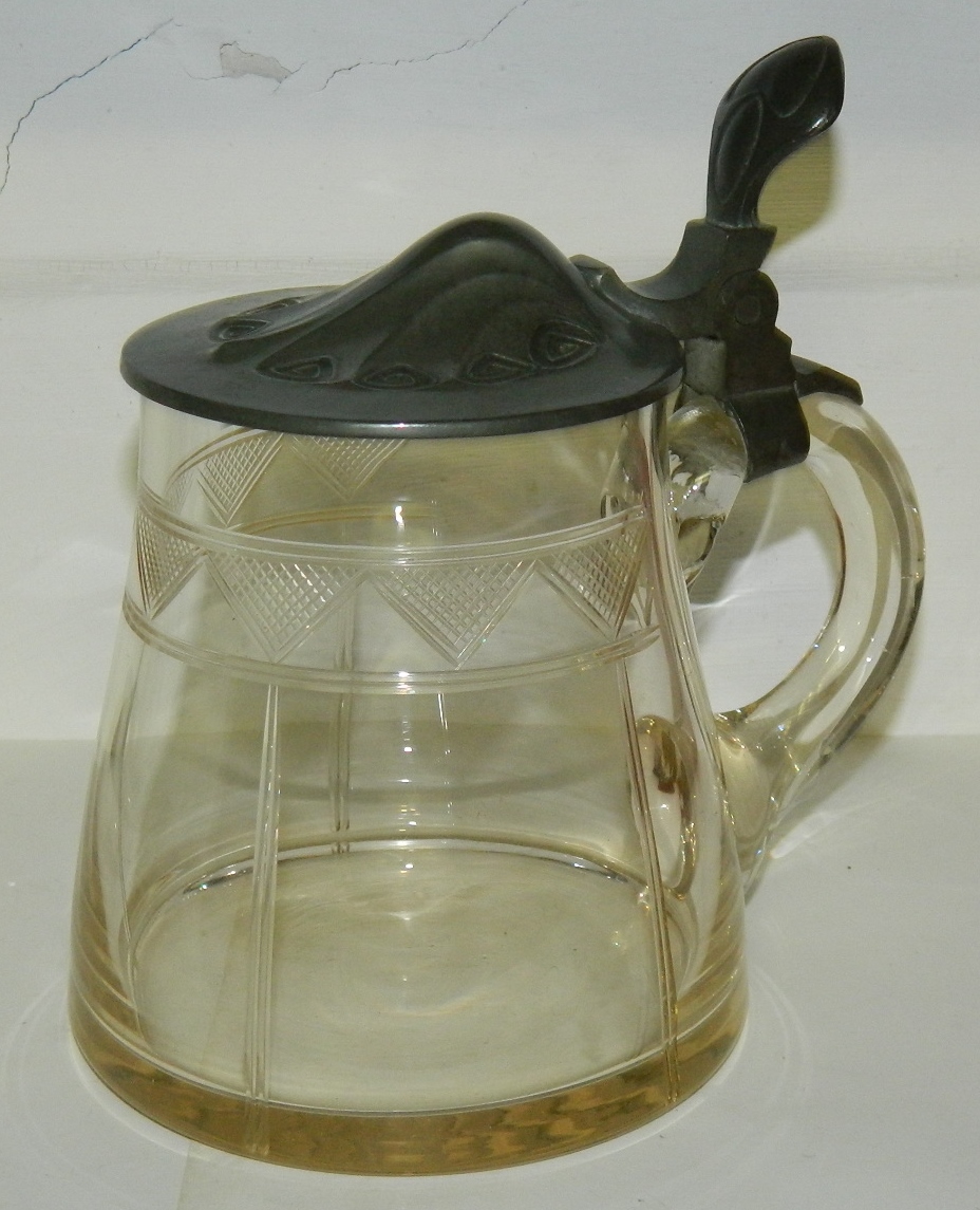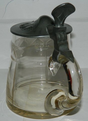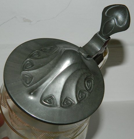 Bengit-Zinn tinlåg i jugens-stil på hankekrus i glas med slibninger. Fra begyndelsen af 20. århundrede. Låget er fabriksstemplet. Glas og låg fremstår i god stand uden skader eller reparationer. 14½-15 cm høj.